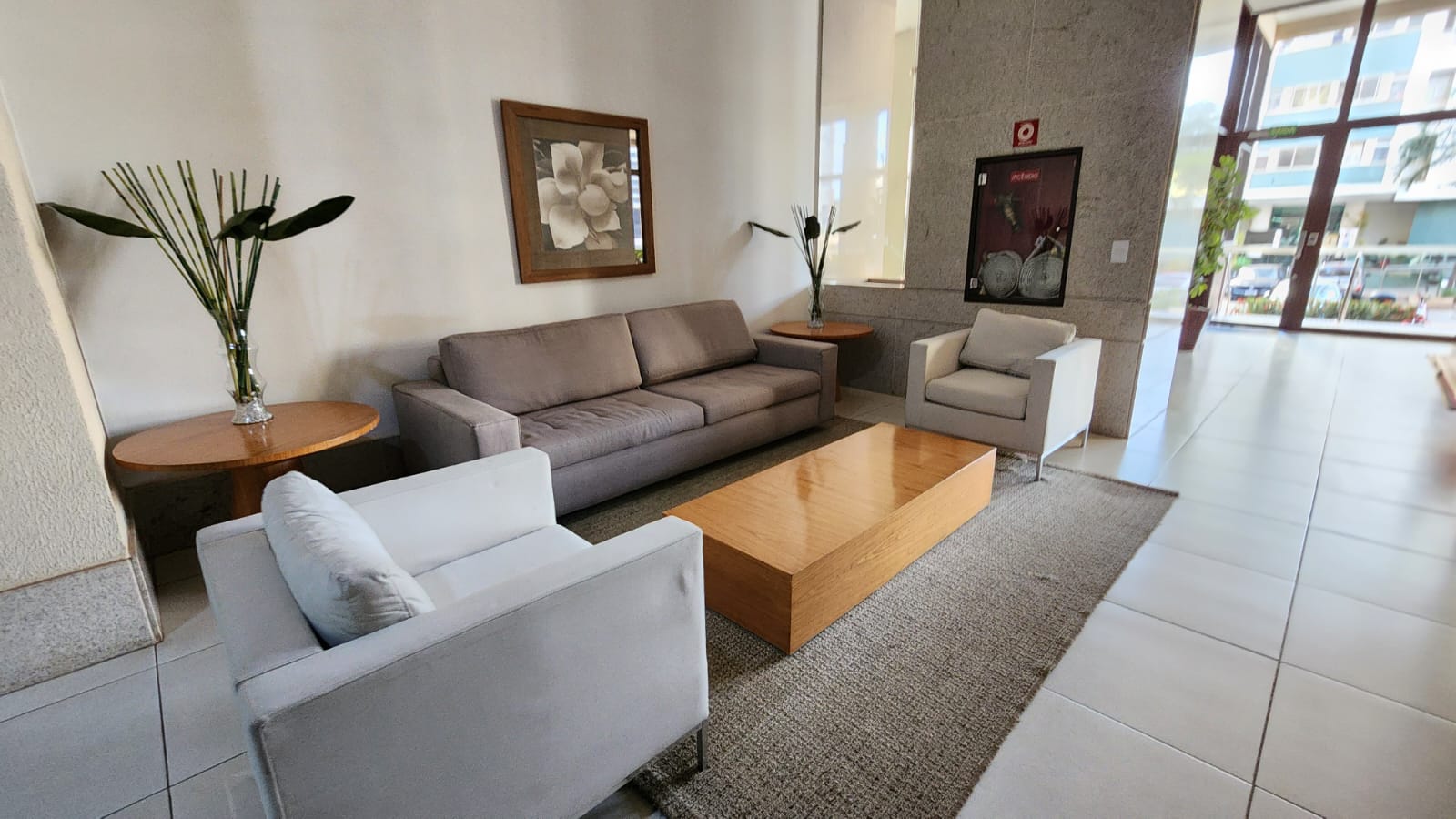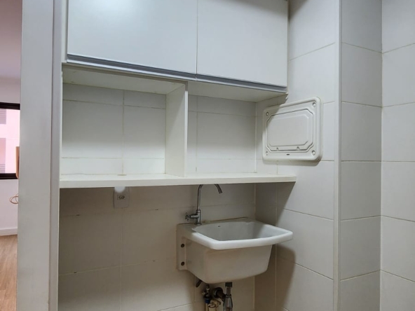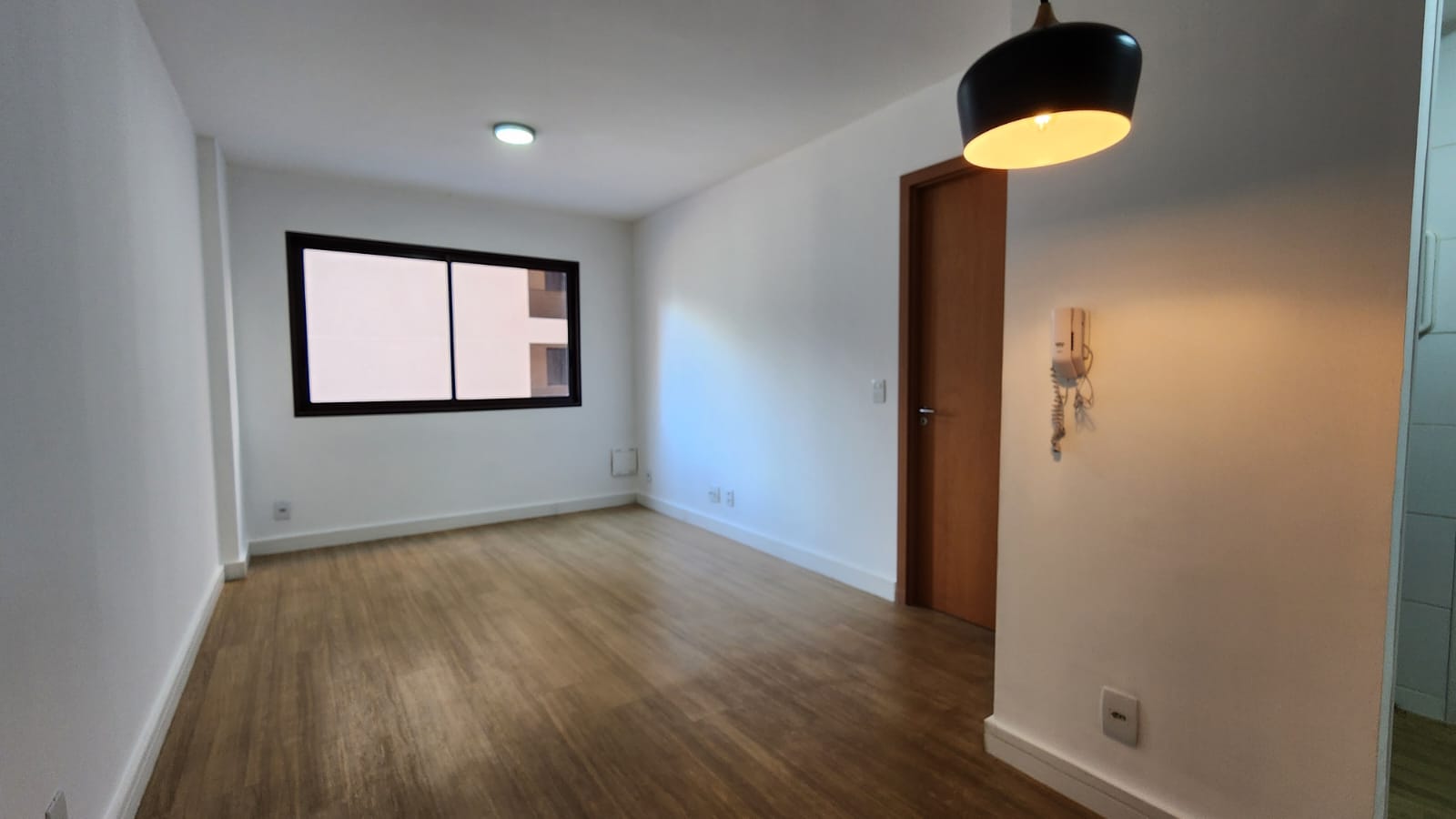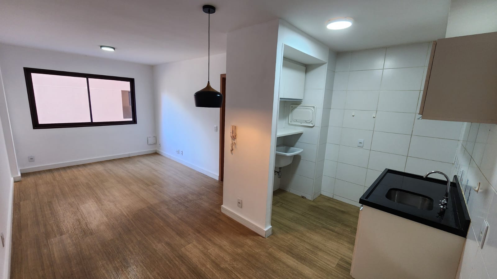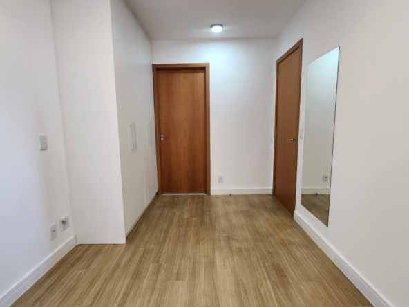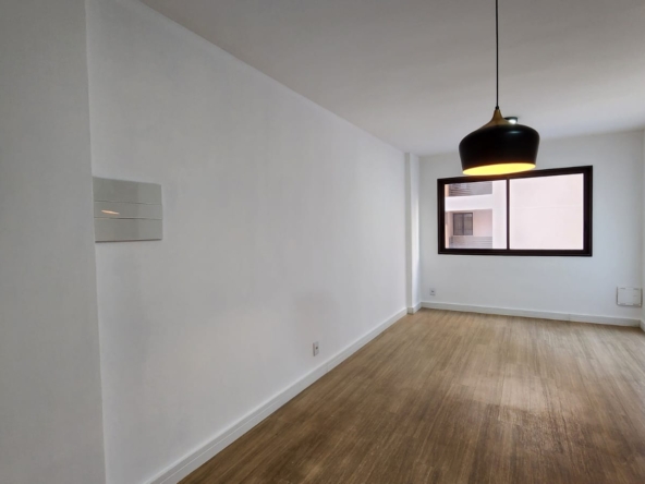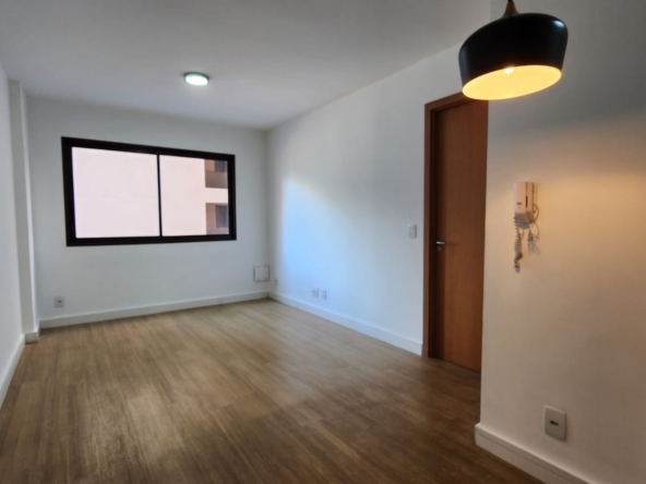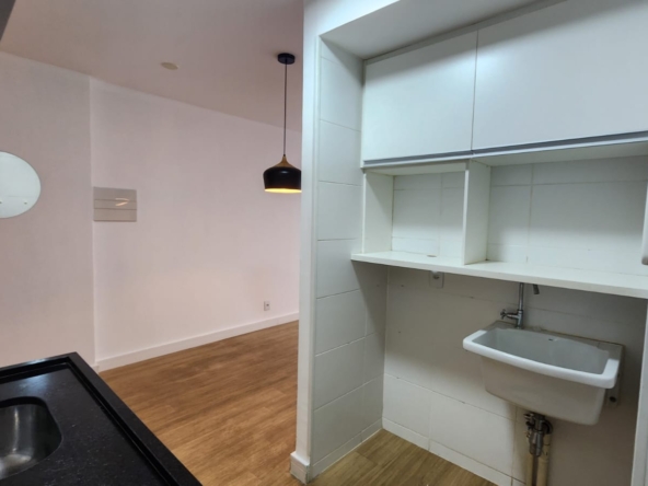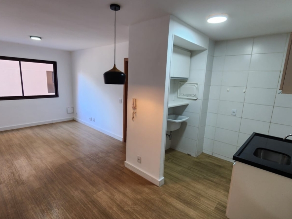 – Sala ampla com varanda, vista livre. Ar-condicionado, sofá para dois, rack, TV, bancada para home office, poltrona, mesinha de canto, luminárias e quadros decorativos. Piso vinílico.