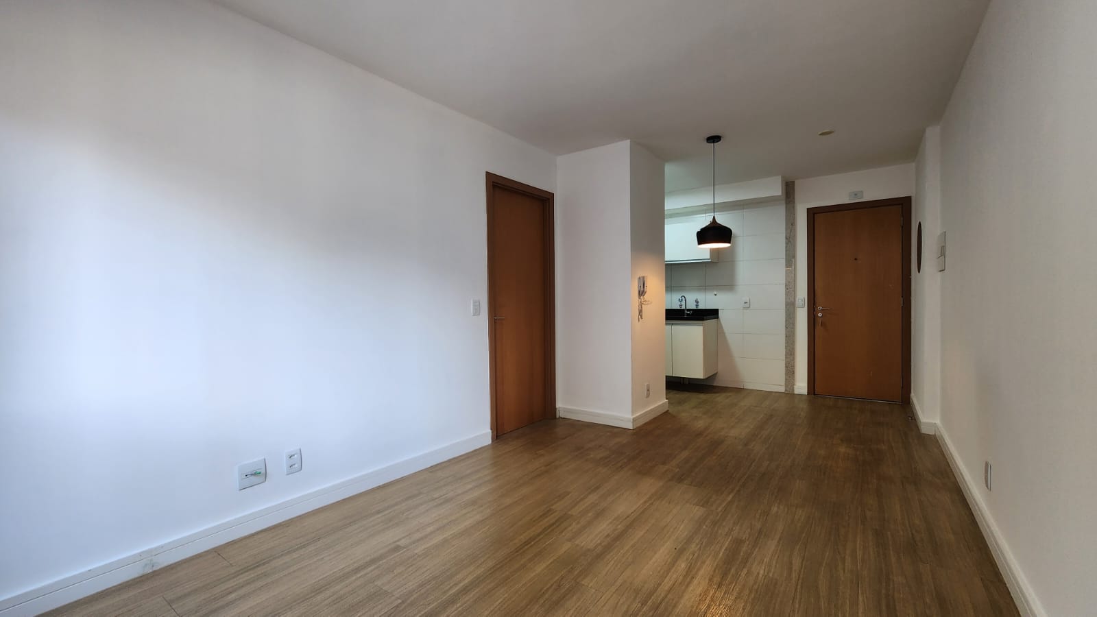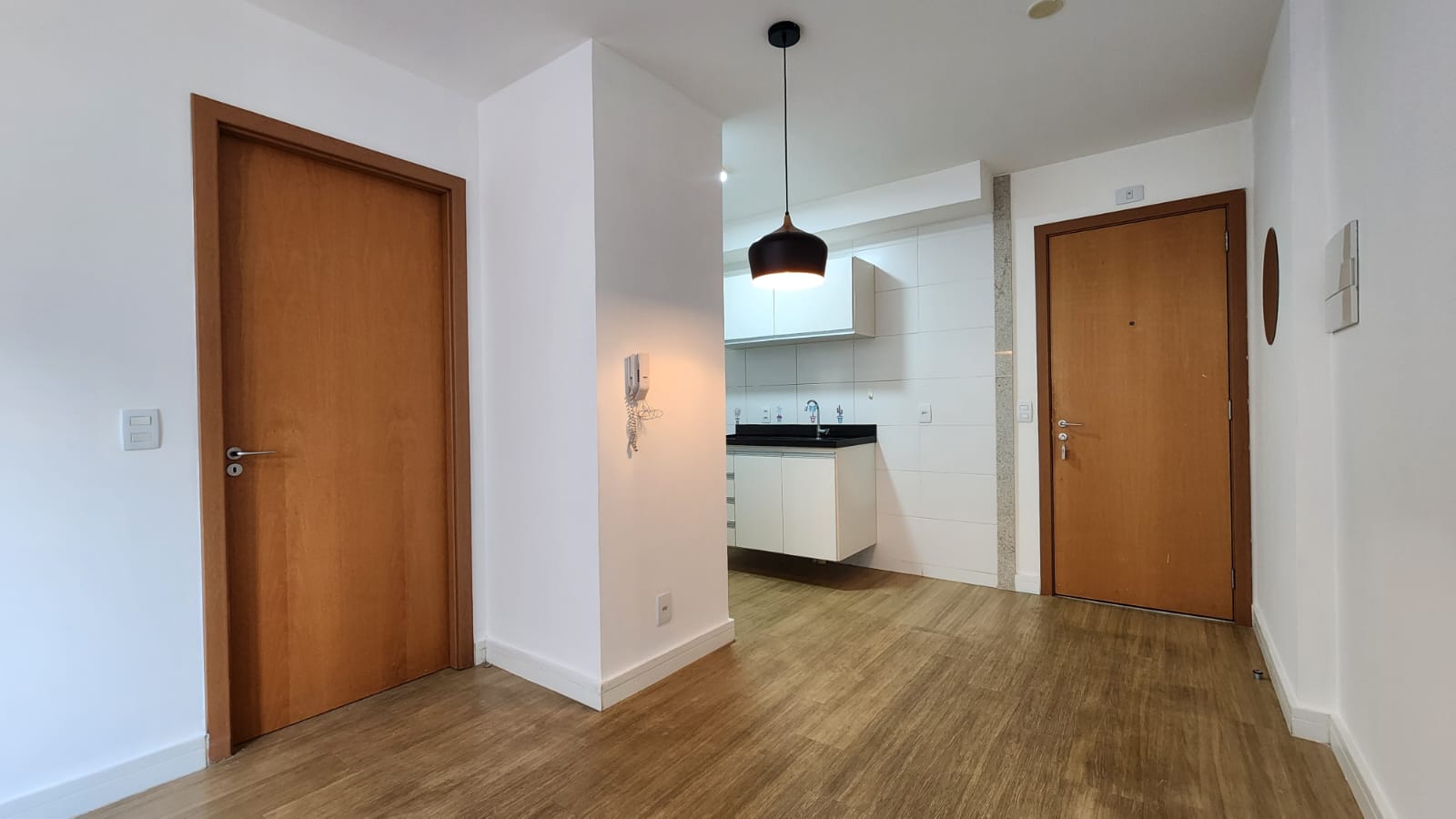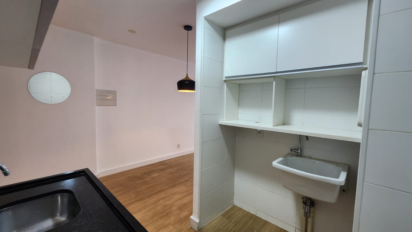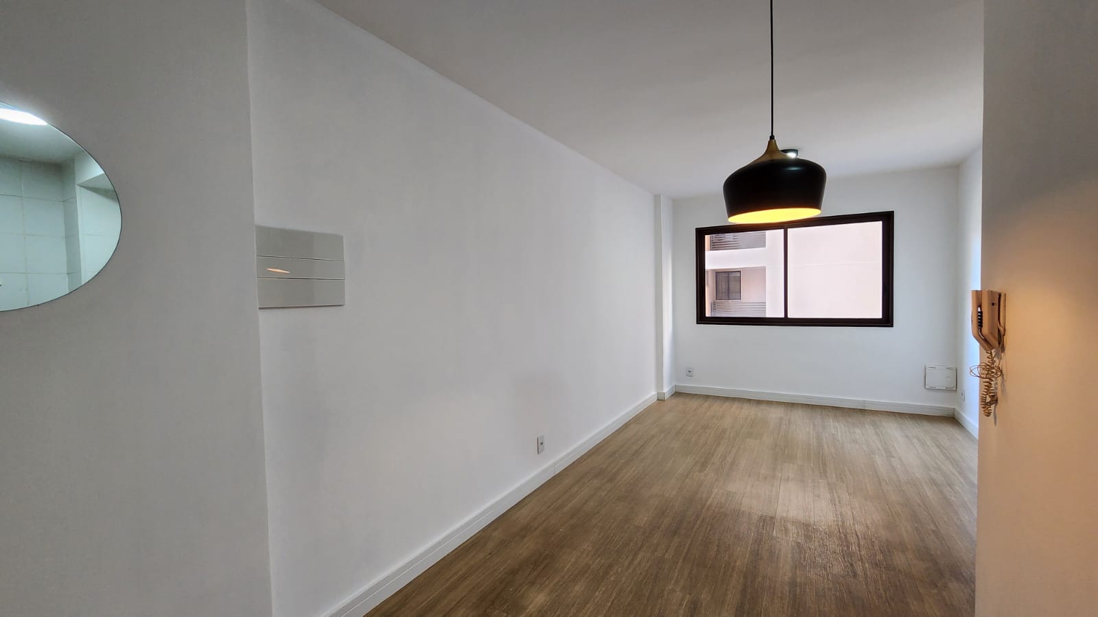 – Sala ampla com varanda, vista livre. Ar-condicionado, sofá para dois, rack, TV, bancada para home office, poltrona, mesinha de canto, luminárias e quadros decorativos. Piso vinílico.