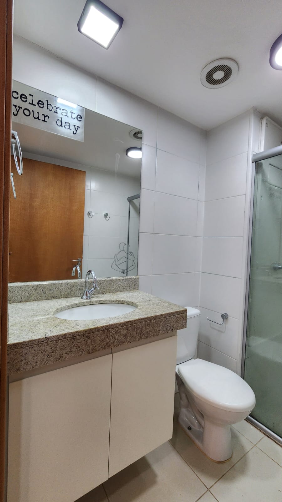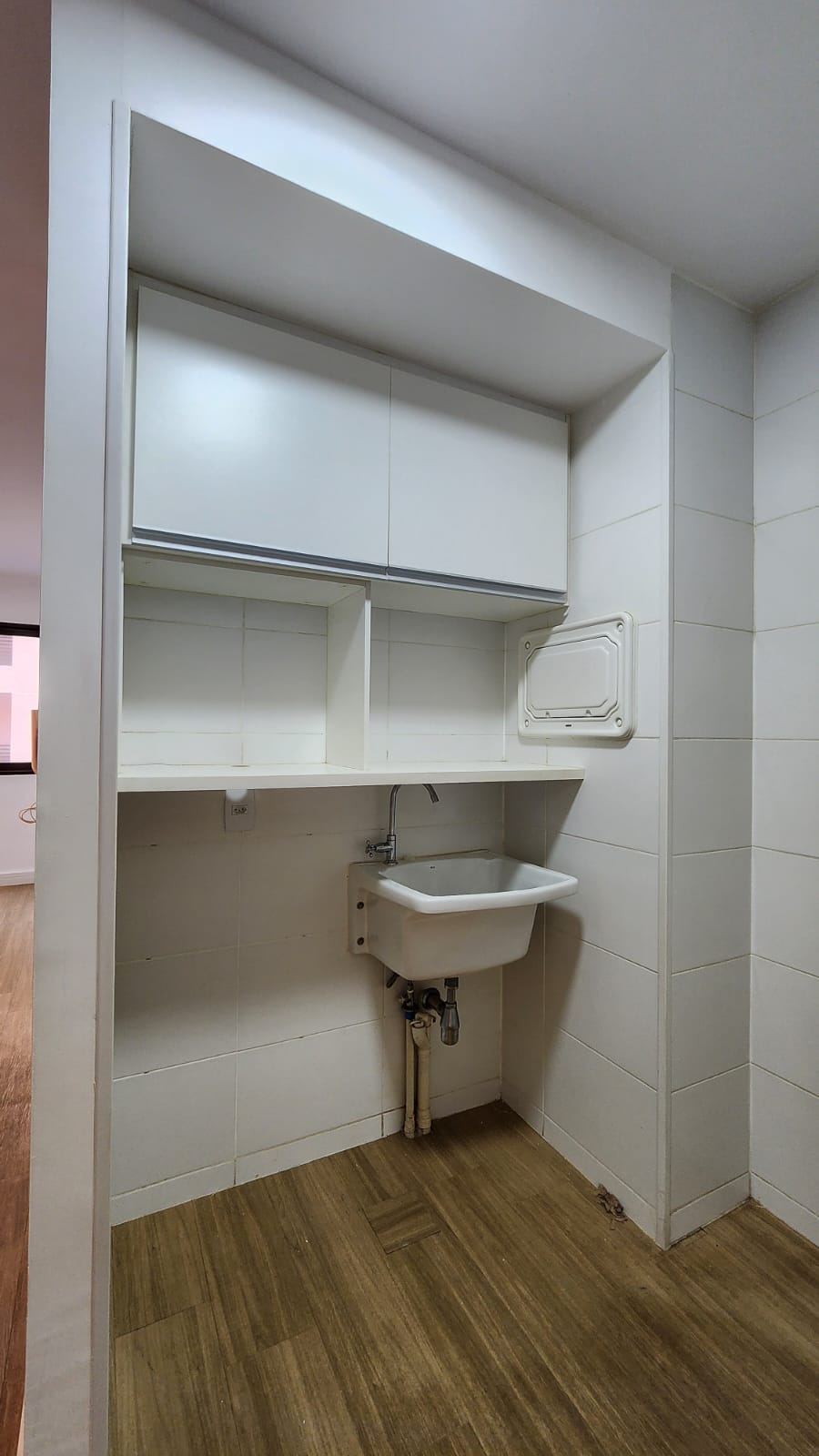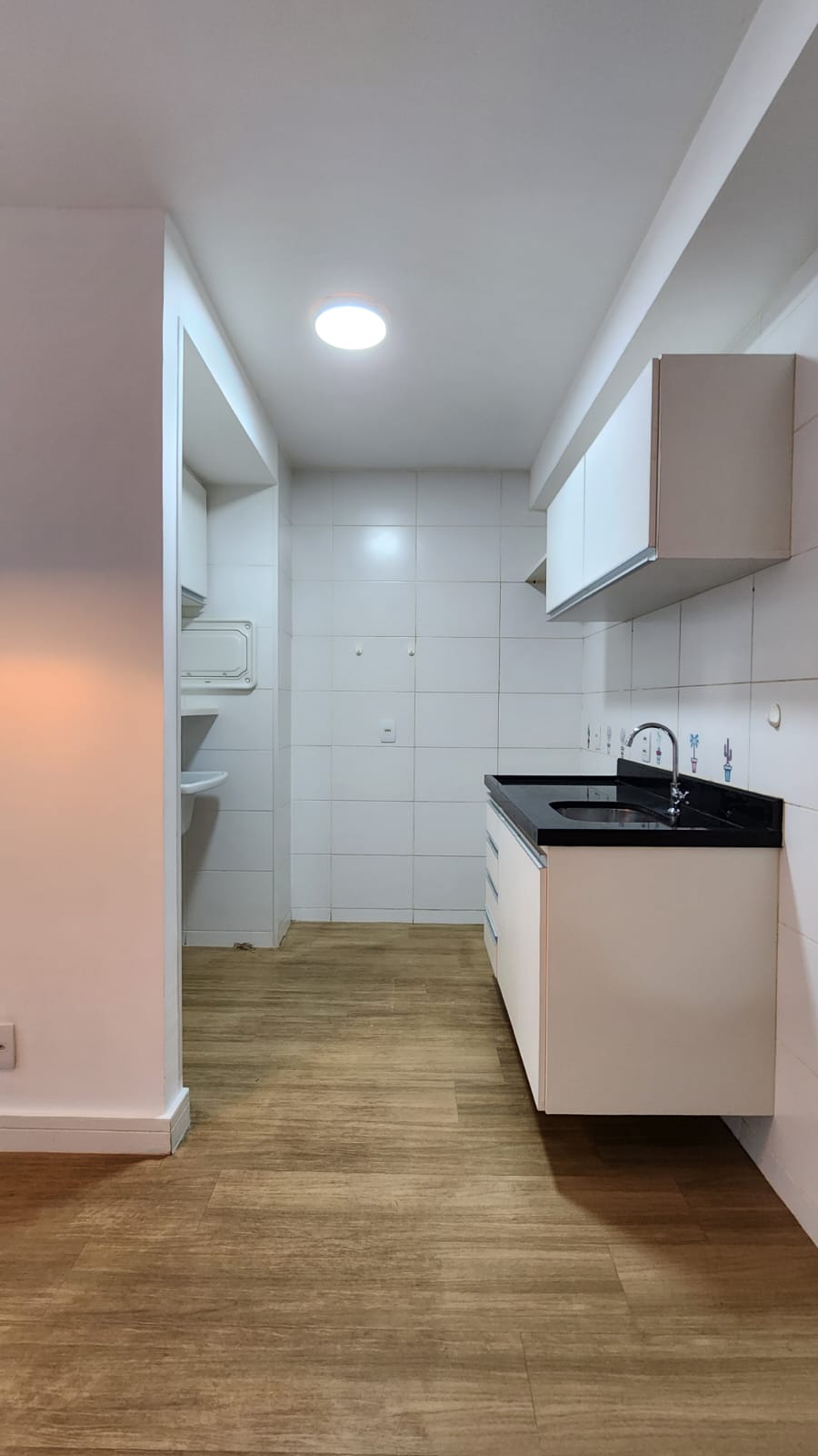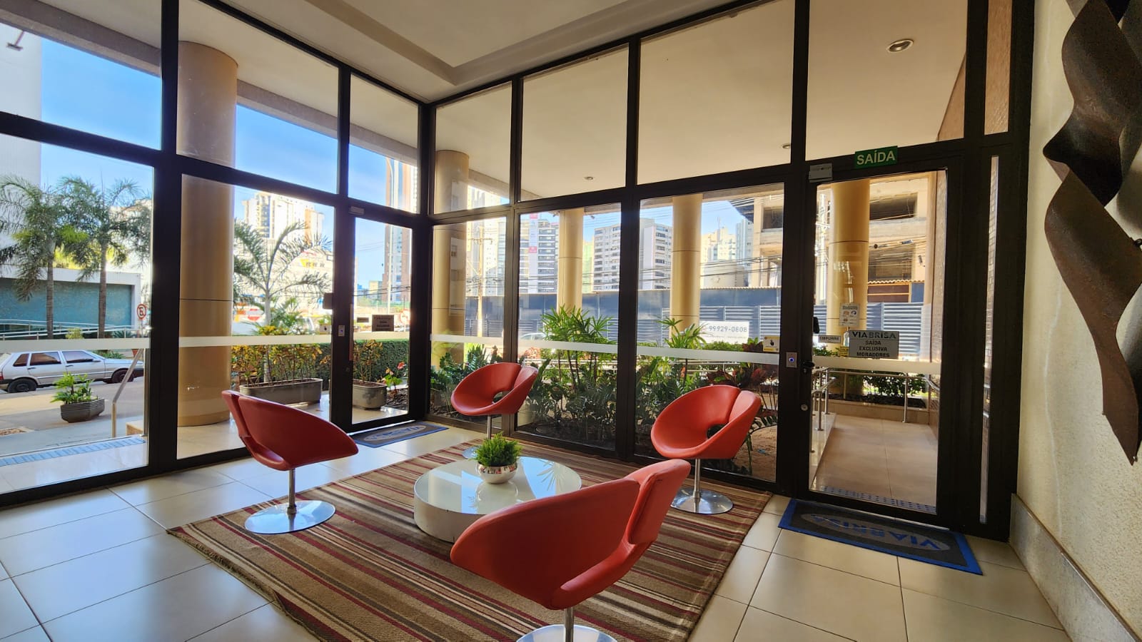 – Sala ampla com varanda, vista livre. Ar-condicionado, sofá para dois, rack, TV, bancada para home office, poltrona, mesinha de canto, luminárias e quadros decorativos. Piso vinílico.