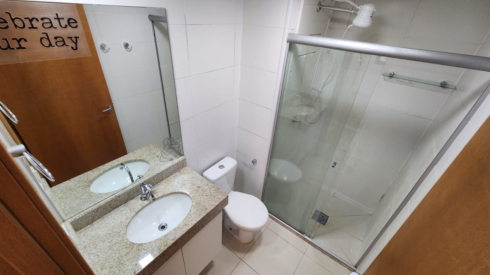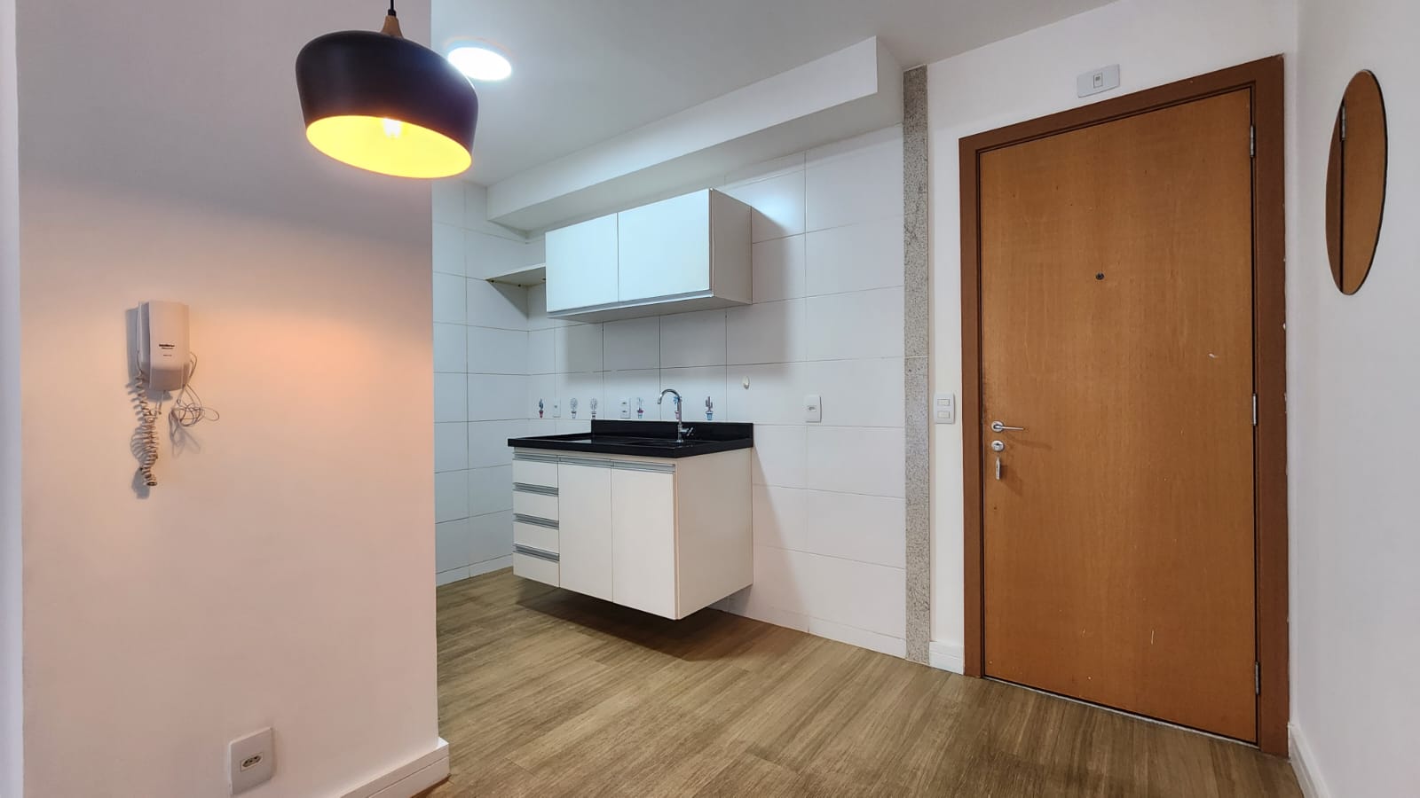 – Cozinha com armários planejados, bancada em granito, piso em granito também; frigobar; bancada para refeições (2 cadeiras); acessórios, espelho e luminária.