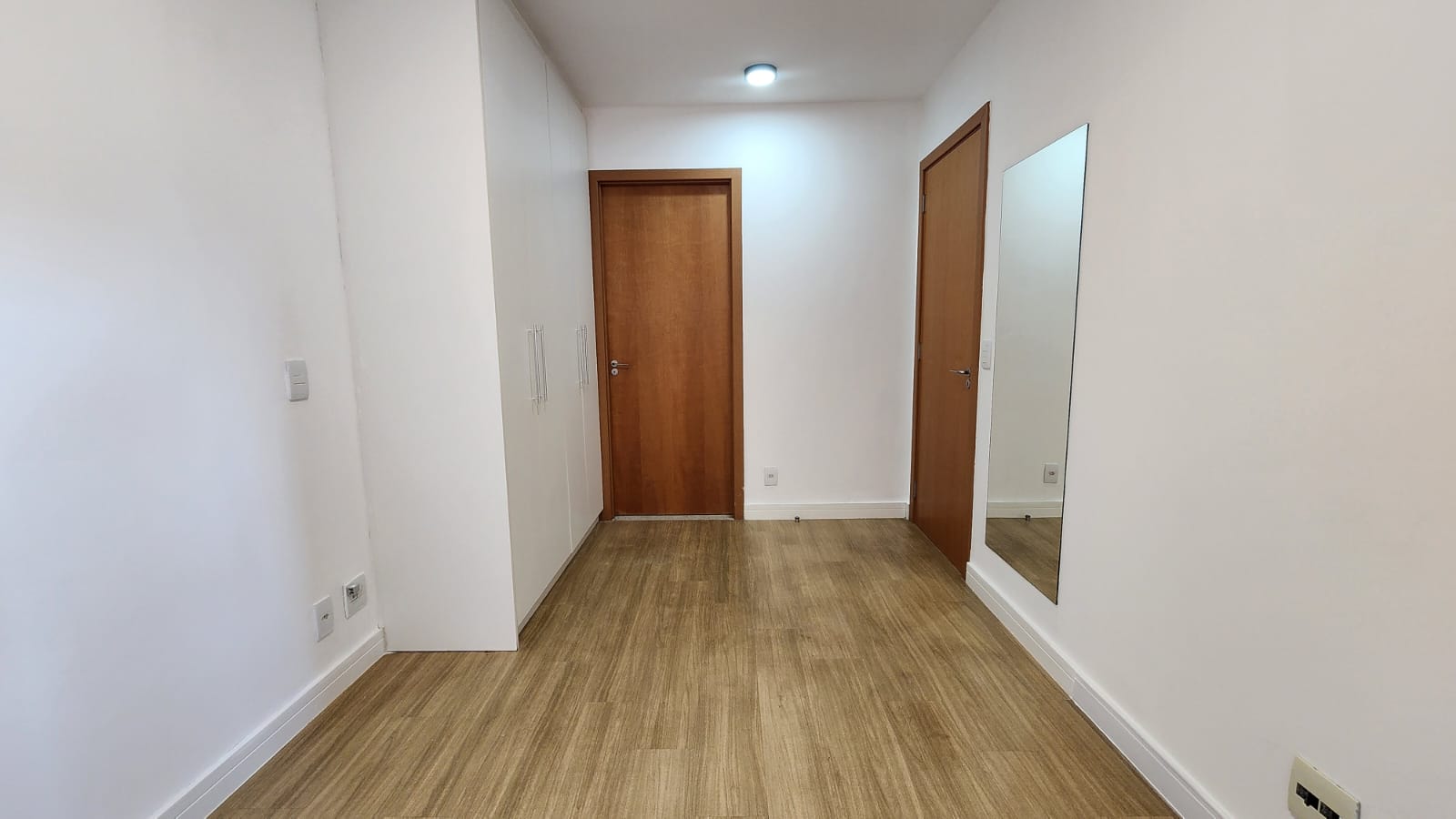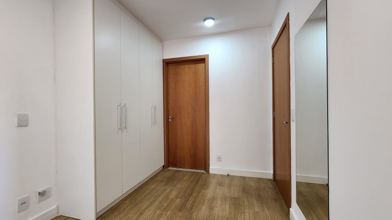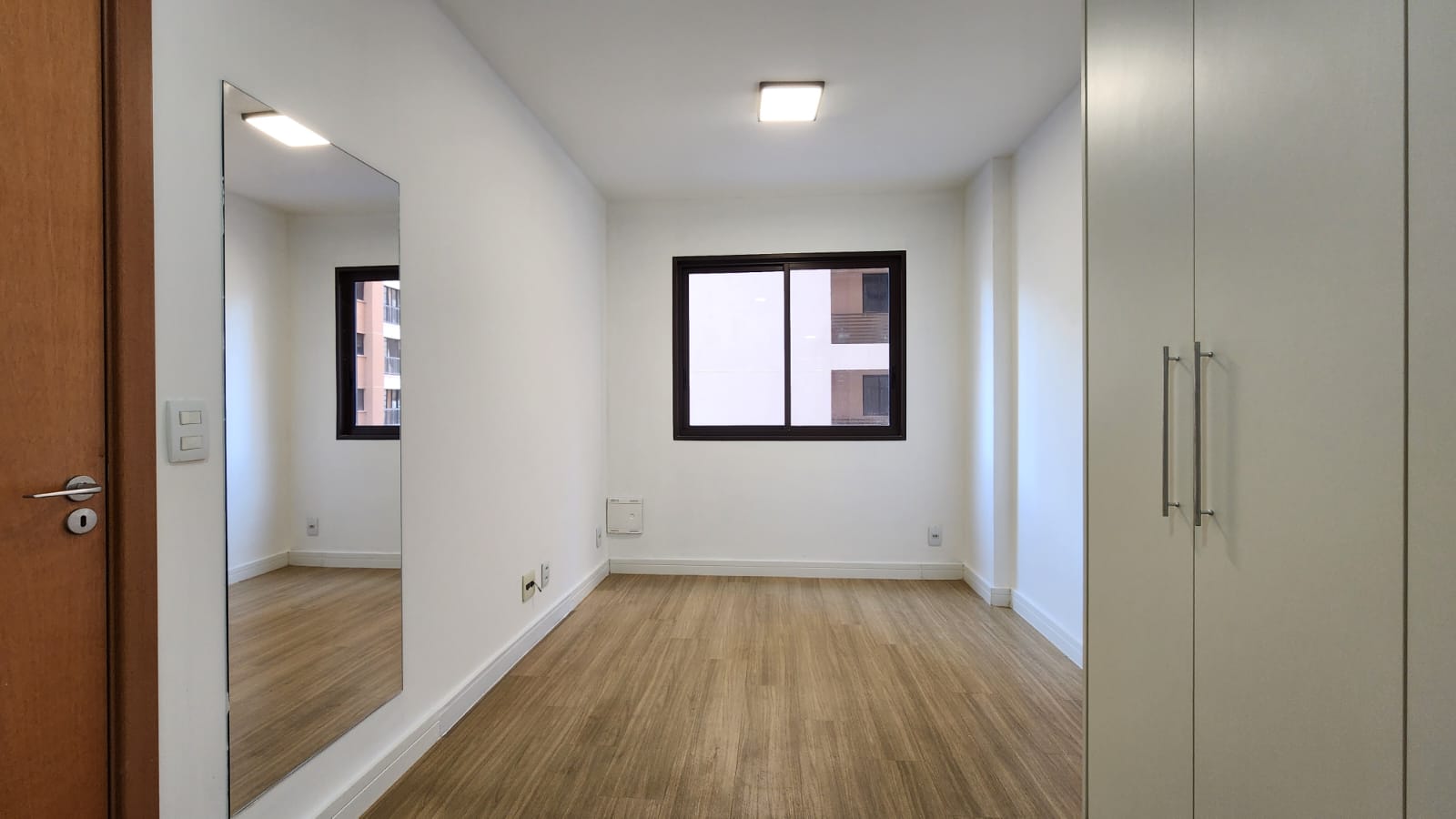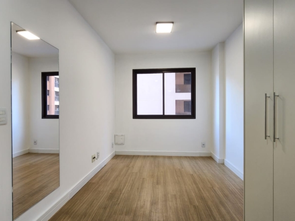 – Quarto suíte com cama box casal, cabeceira com quadro decorativo JK, criados-mudos, abajur, ar-condicionado, TV, espelhos, luminárias, armário tipo roupeiro embutido; varanda ampla com vista livre.