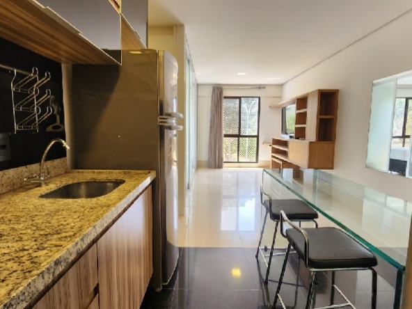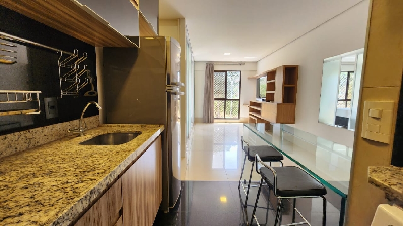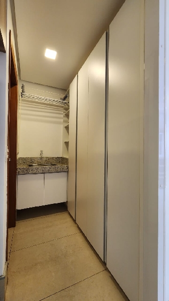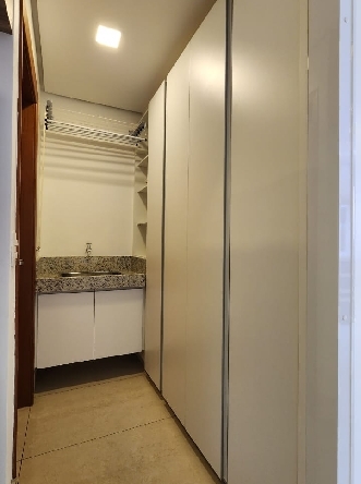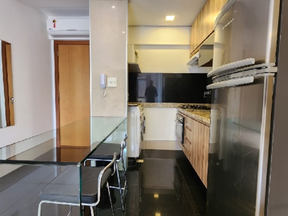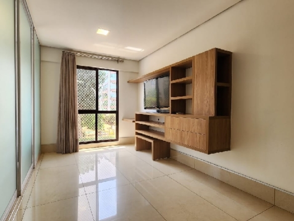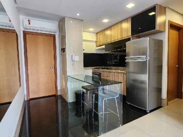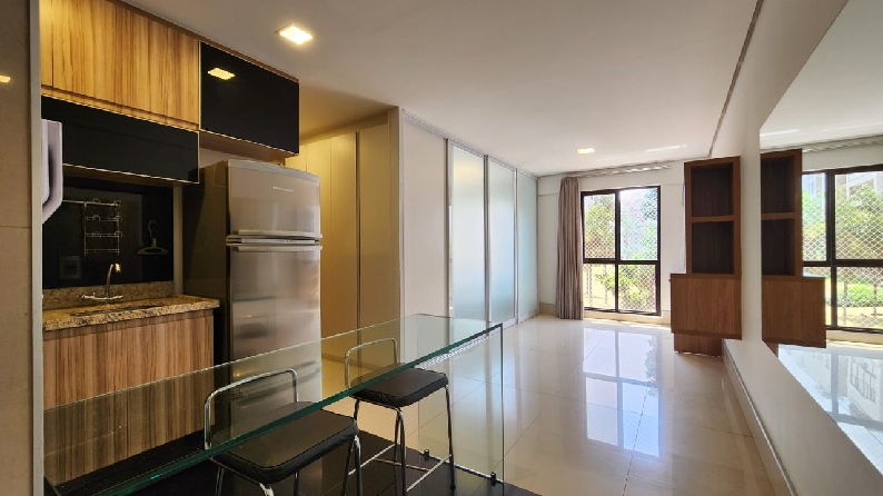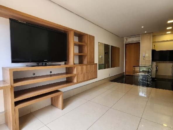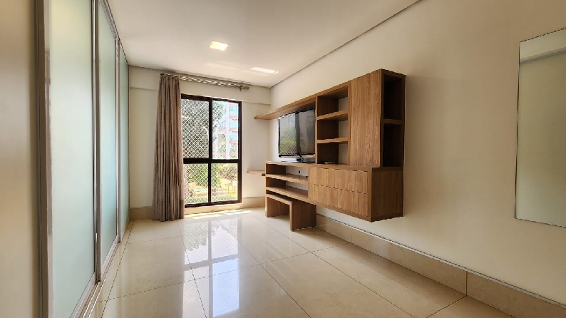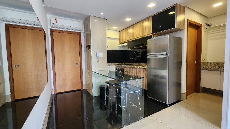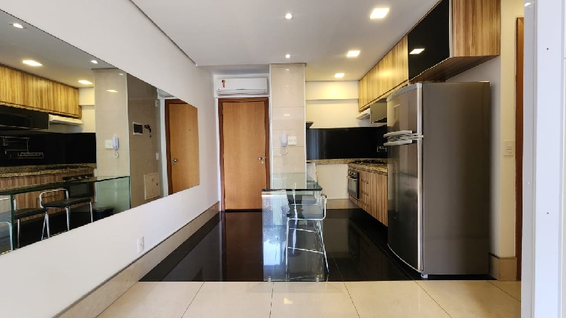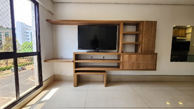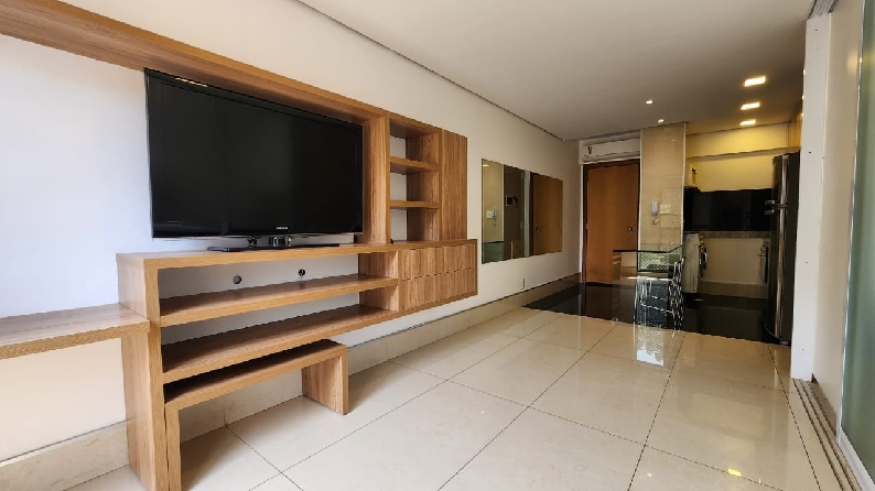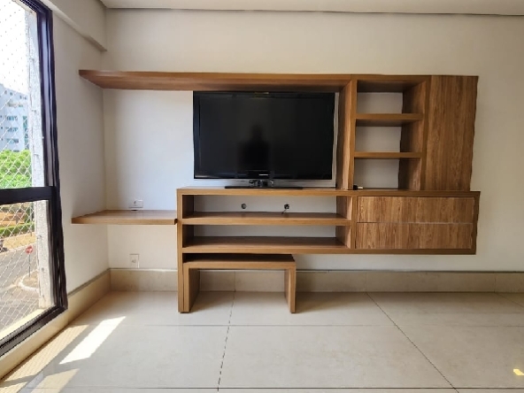 – Sala com piso em porcelanato, painel com rack embutido, Tv, ar-condicionado para sala e cozinha, teto rebaixado em gesso, iluminação planejada, cortinas e vista livre;