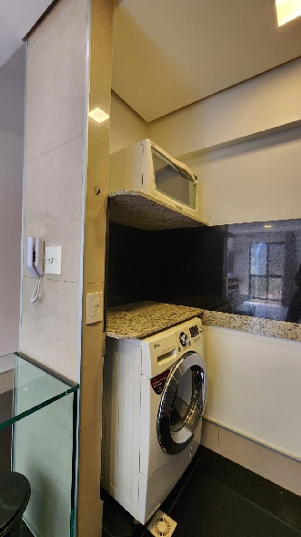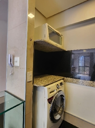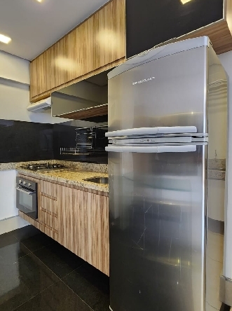 – Cozinha com armários planejados, teto rebaixado em gesso com iluminação planejada, mesa de vidro embutida, geladeira, fogão cook top, forno embutido, depurador, 2 banquetas, microondas, escorredor de louças, bancada da pia em granito; Área de serviço com tanque, armários, varal, máquina lava e seca;