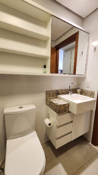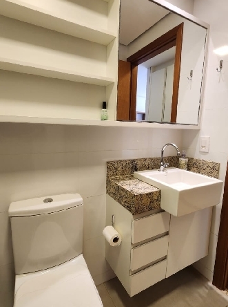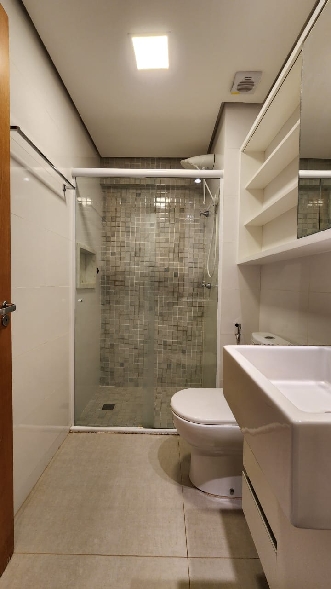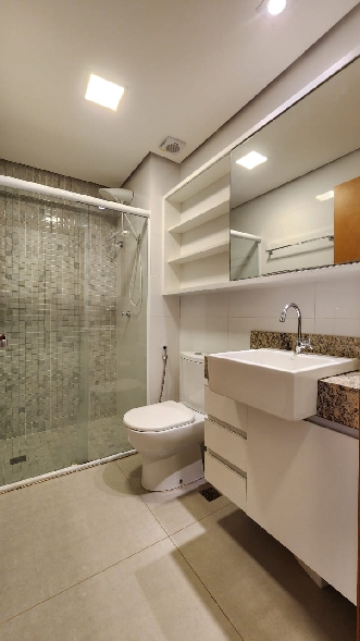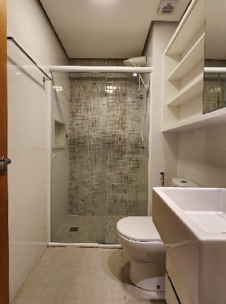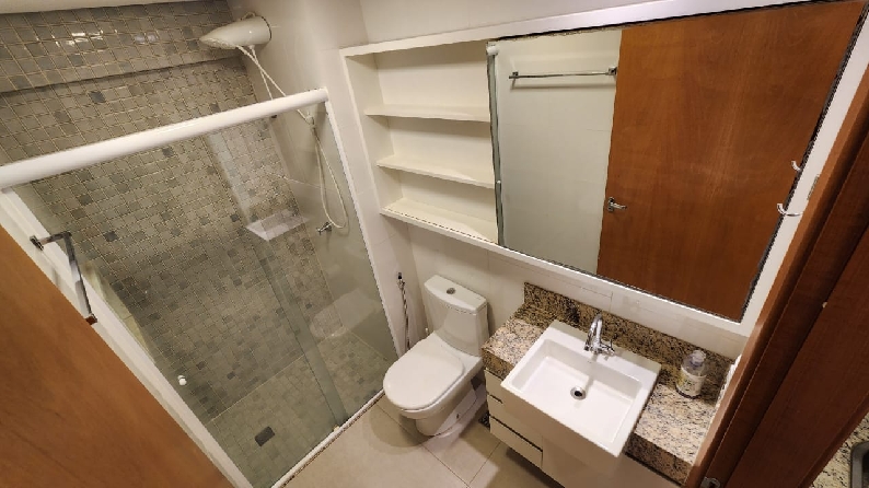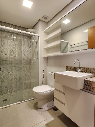 – Banheiro social com pia bancada em granito, armários planejados, espelho, box em vidro temperado, piso e paredes revestidos em cerâmica;