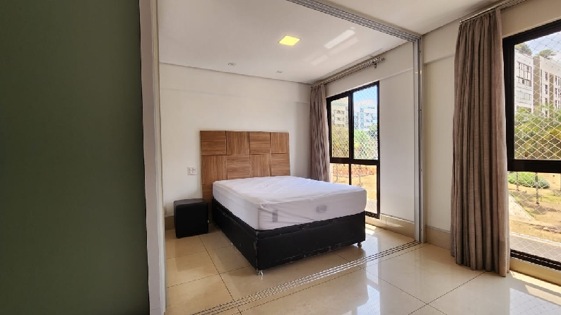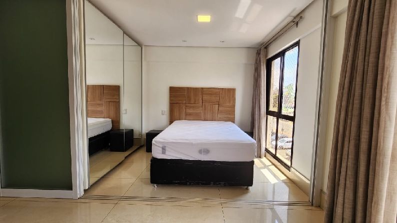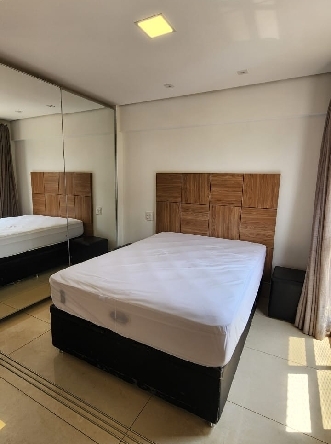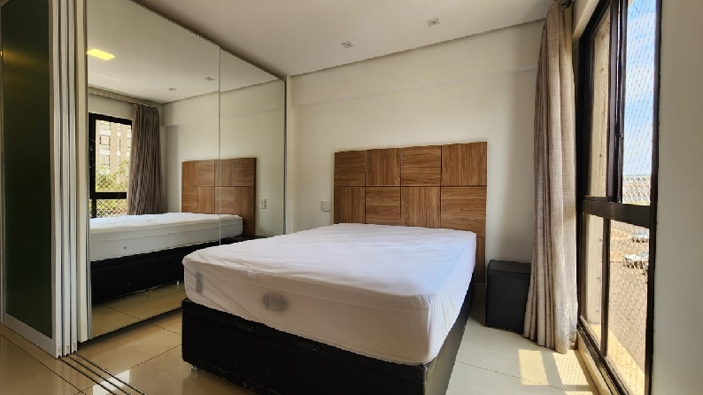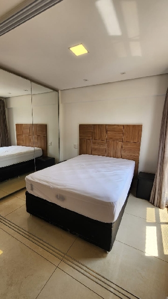 – Quarto com divisória 3 folhas, cama box casal, cabeceira, armário roupeiro com portas espelhadas, iluminação planejada; cortinas com black out e vista livre;