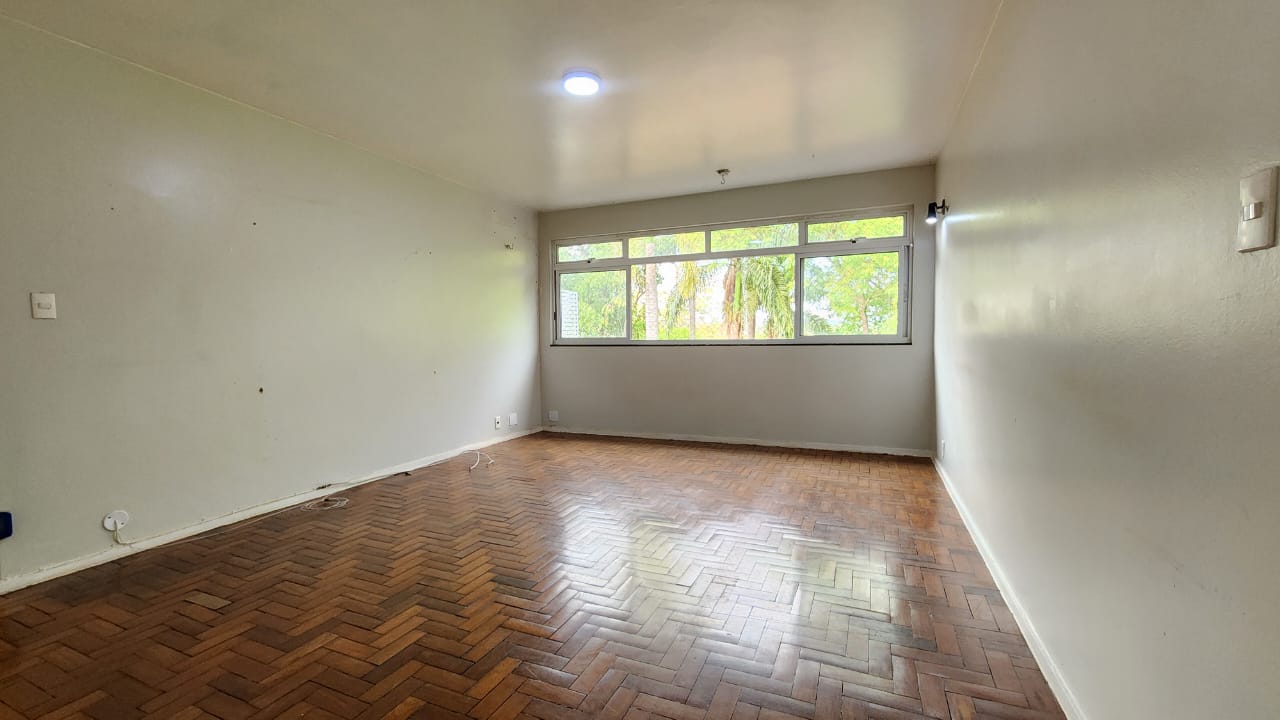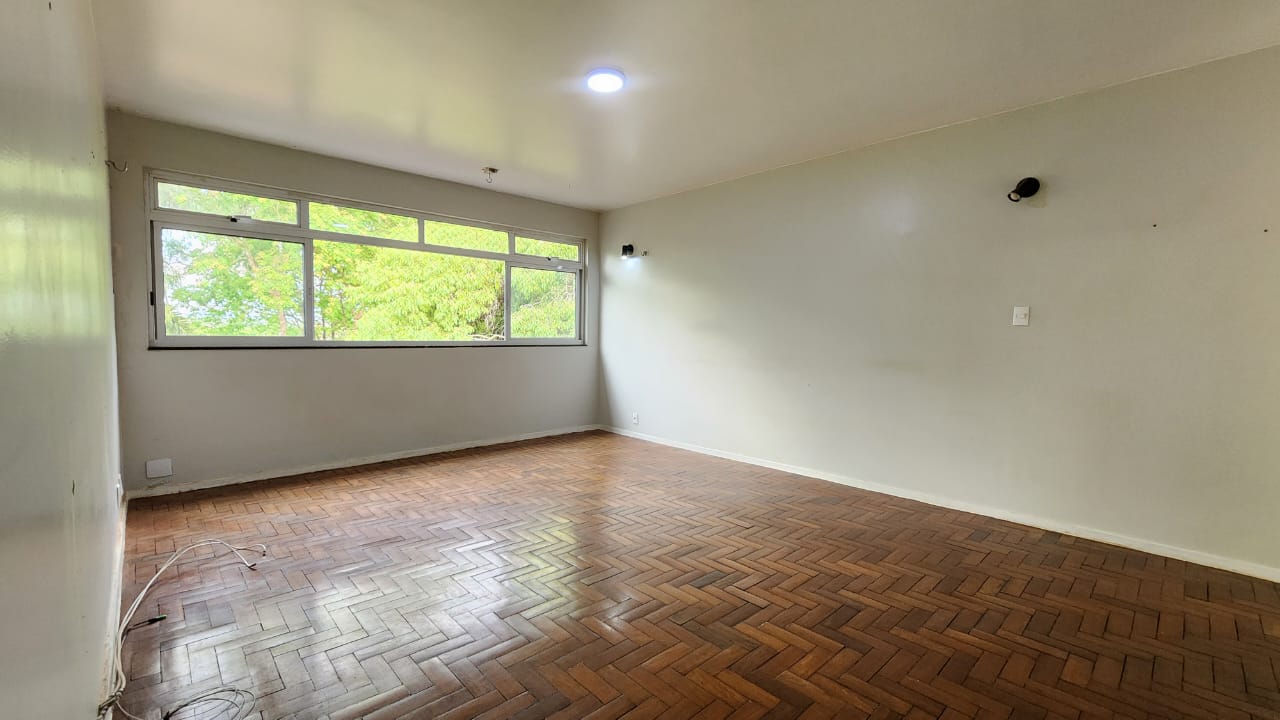 – Sala com piso em taco, luminárias e vista para o jardim;