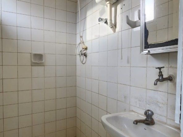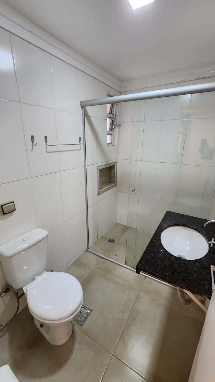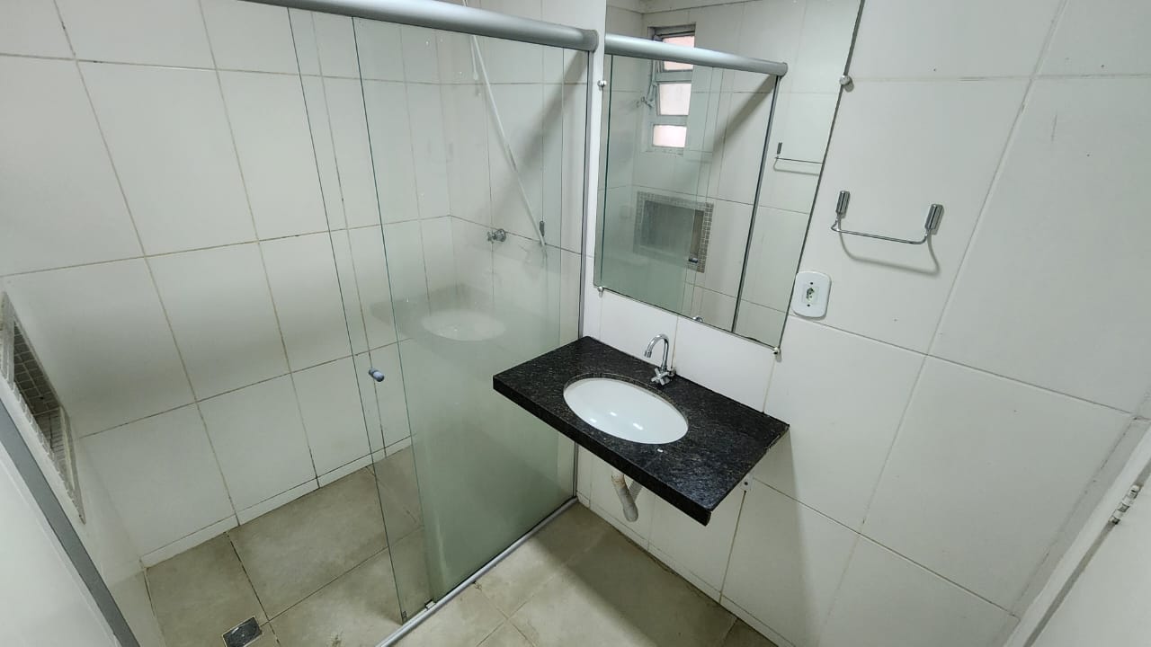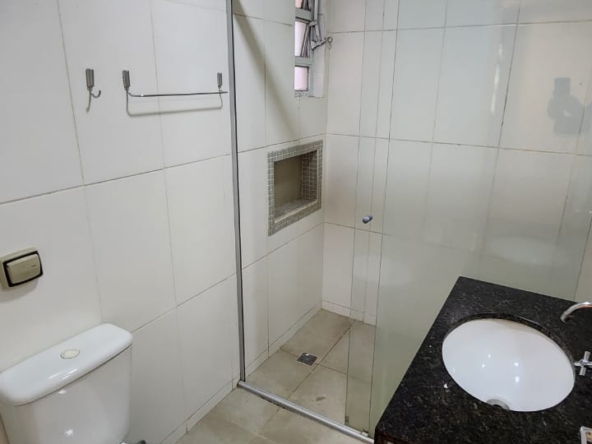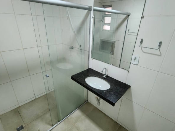 – Banheiro social com pia bancada em granito, espelho e box em vidro temperado;
