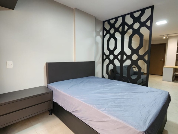 – Quarto confortável com cama box casal e colchão, criado-mudo com gavetas, divisória decorativa, armário roupeiro, armários maleiro e vista livre.