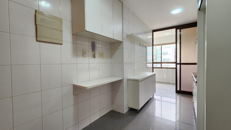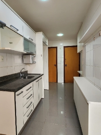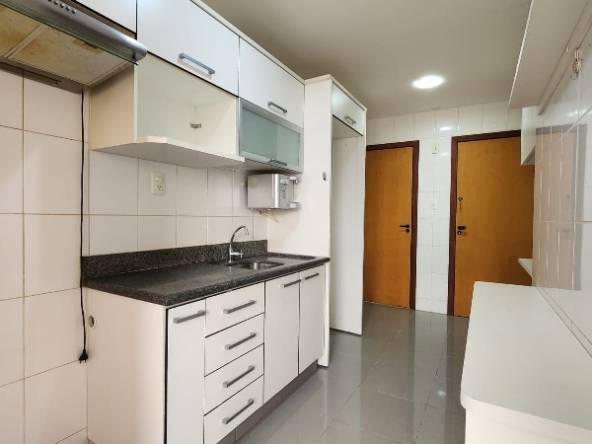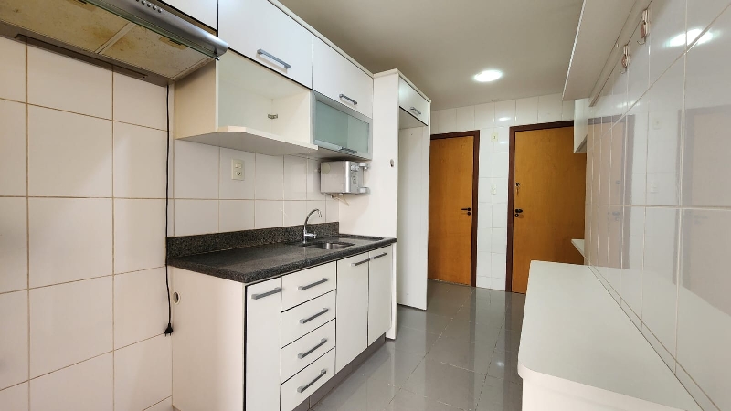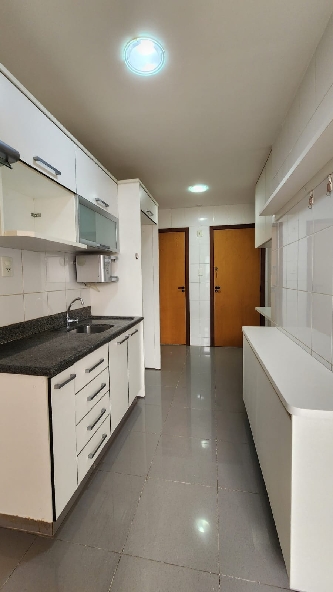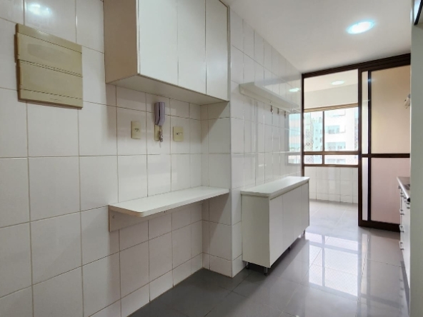– Cozinha planejada, equipada com armários sob medida, bancada em granito, filtro de água, depurador, nicho para microondas, prateleiras, piso em porcelanato e paredes revestidas em cerâmica;