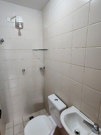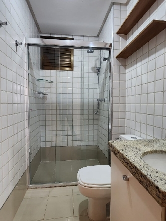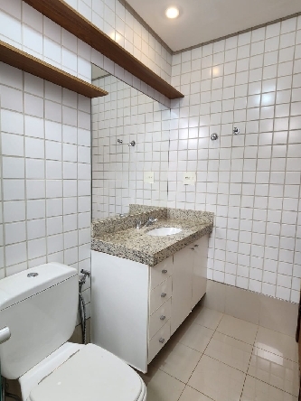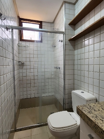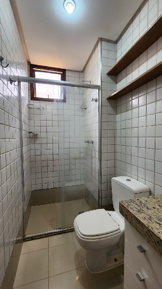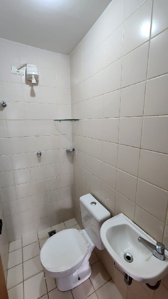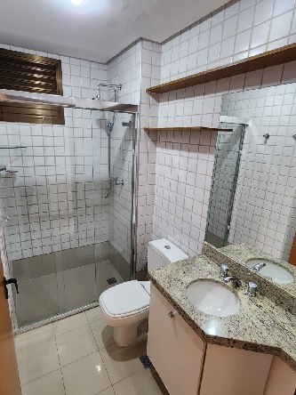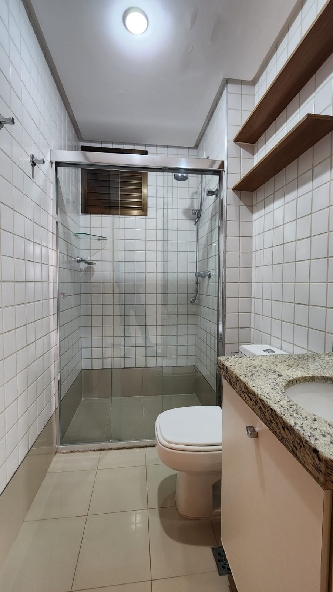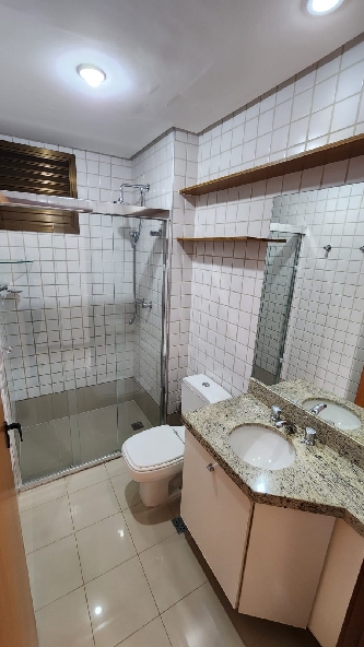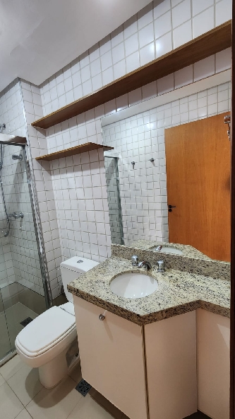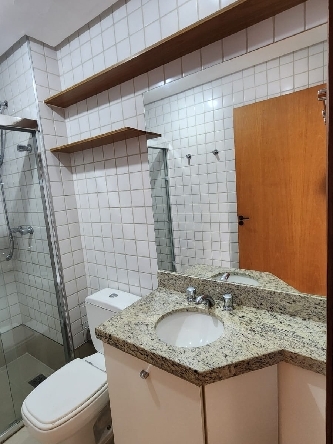 – Banheiro social completo, com armários planejados, espelho, box em vidro temperado, piso em porcelanato, paredes revestidas em cerâmica e acessórios;