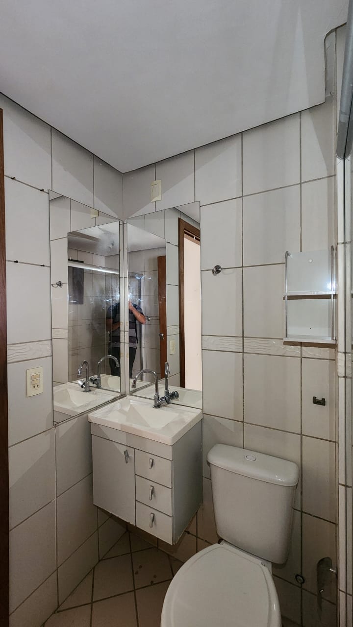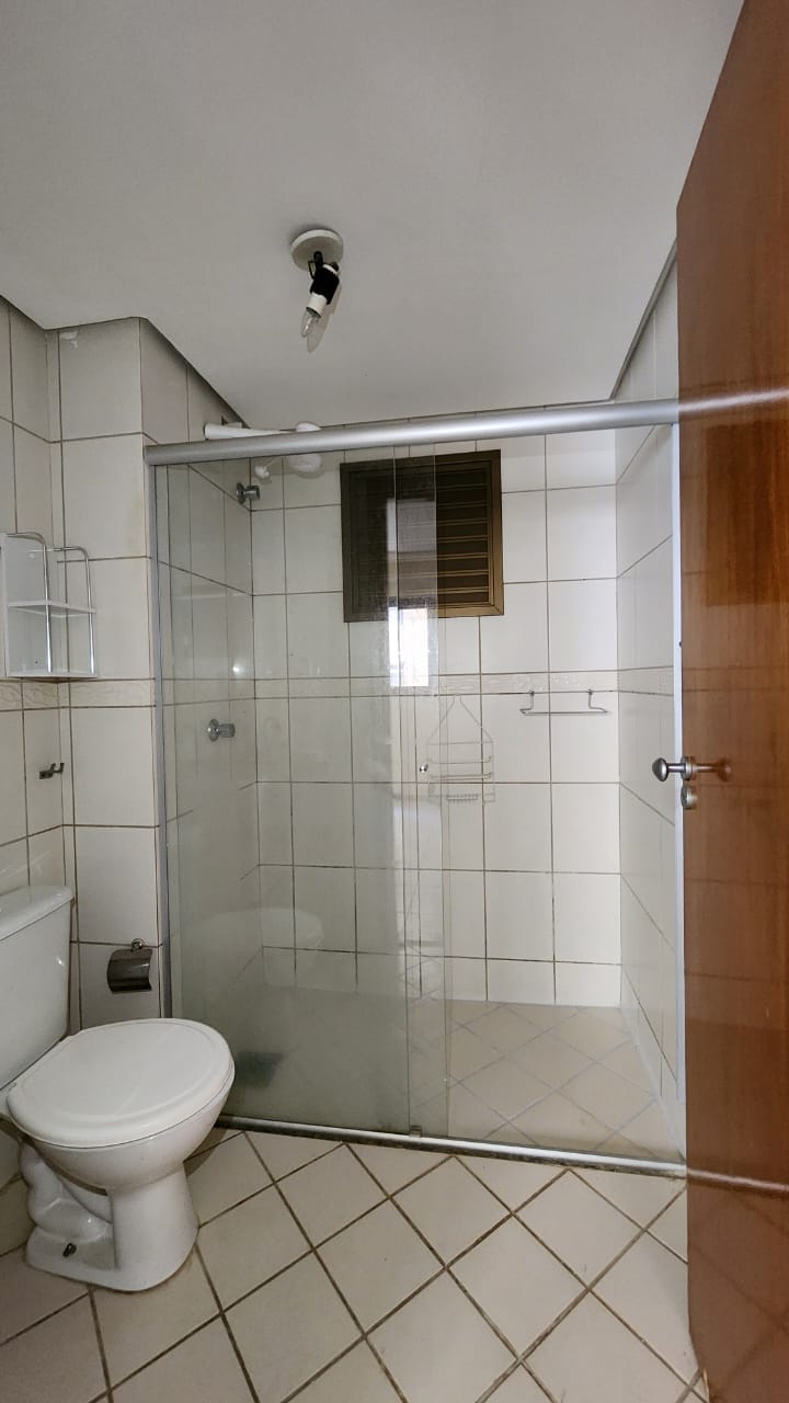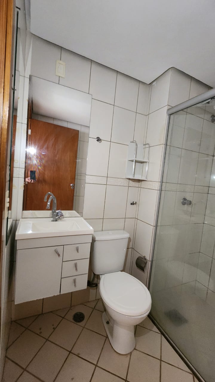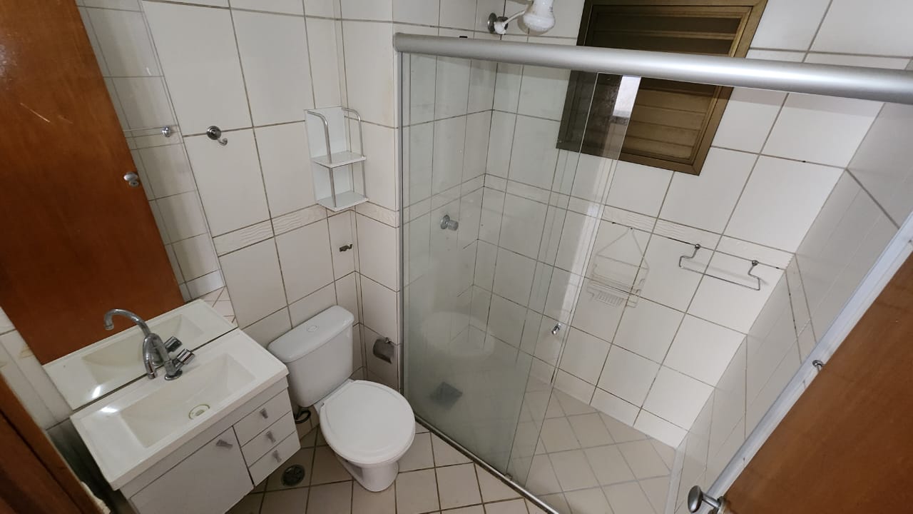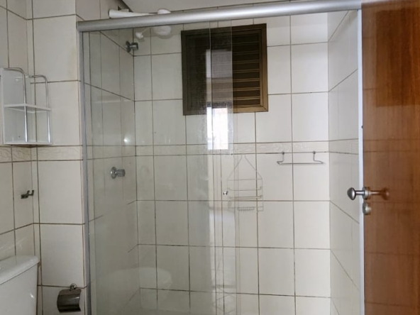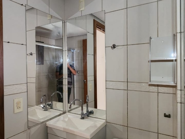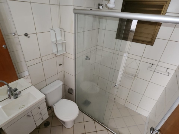 – Banheiro com armários sob a pia, espelho, piso e paredes revestidos em cerâmica, box em vidro temperado e acessórios;