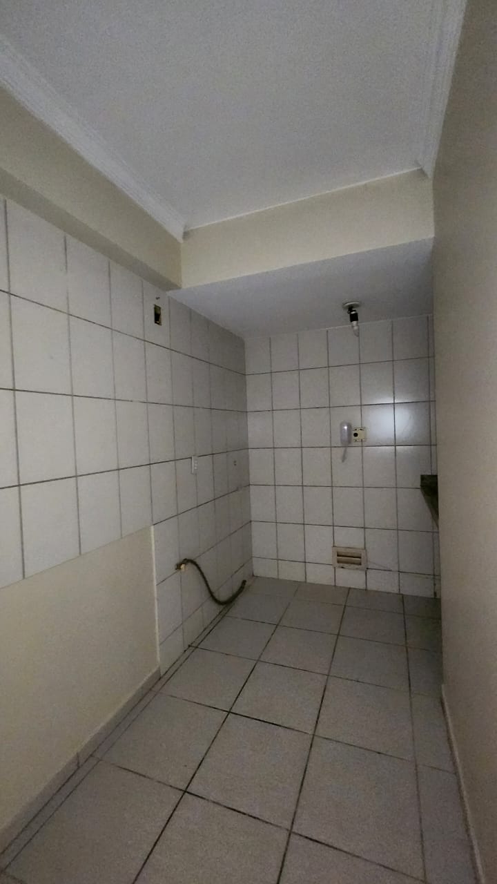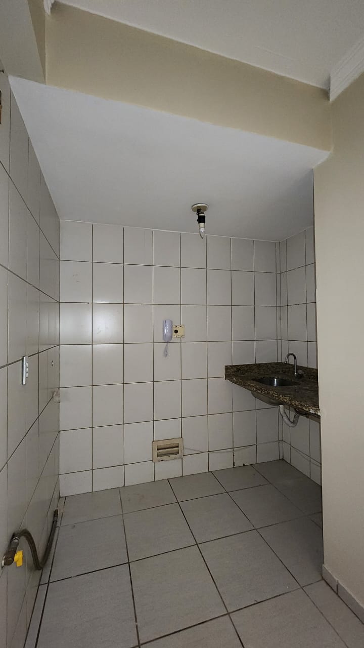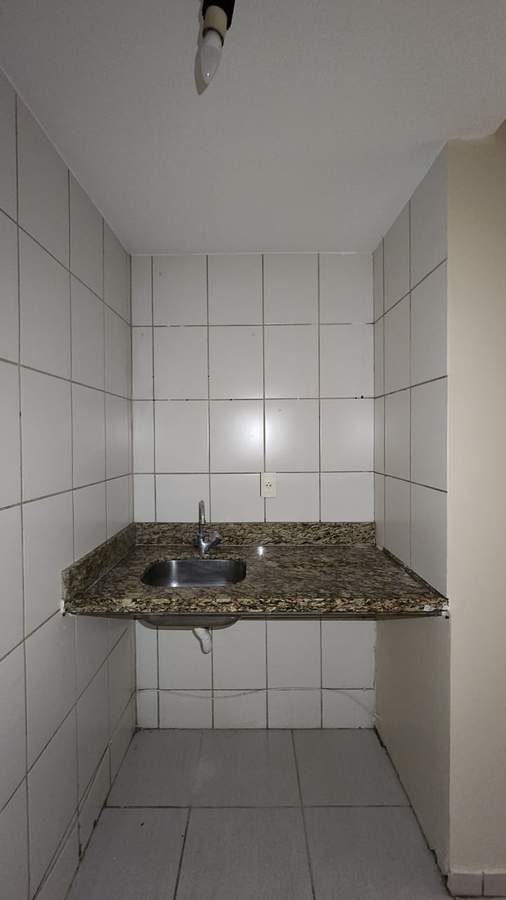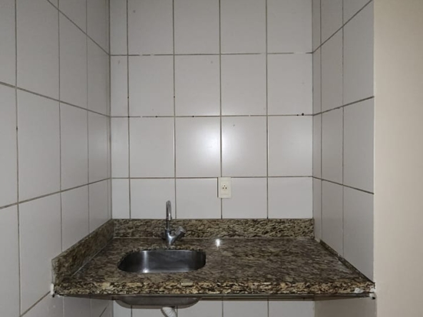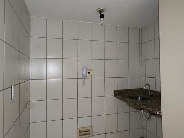 – Cozinha com piso e paredes revestidos em cerâmica, pia bancada em granito e luminária;