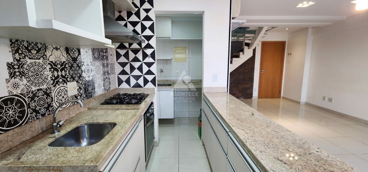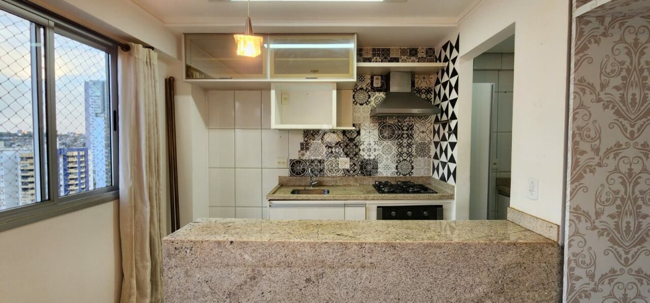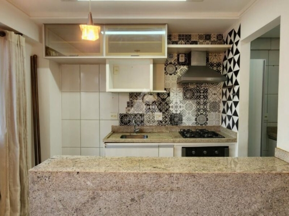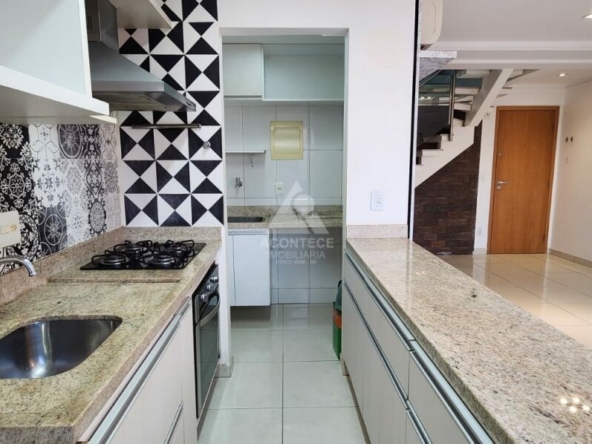 – Cozinha estilo americana, banca em granito, armários planejados, fogão embutido, Cook top 4 bocas, forno embutido, depurador, iluminação planejada, cortina.
