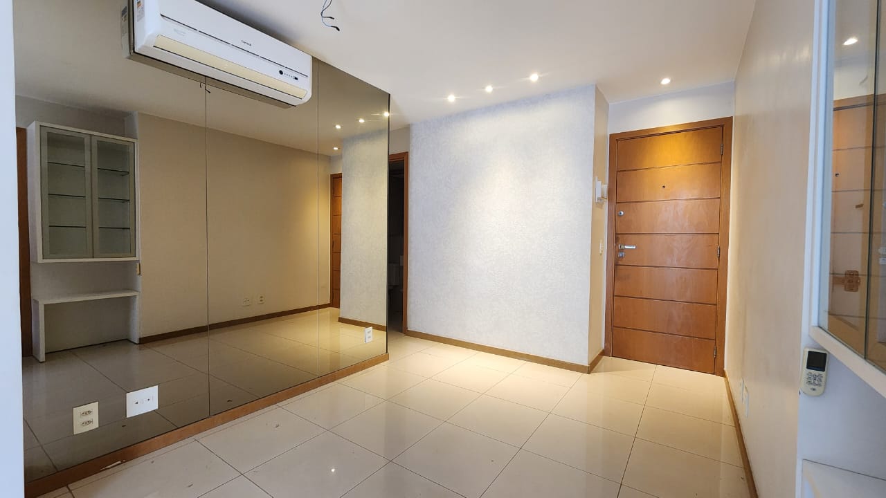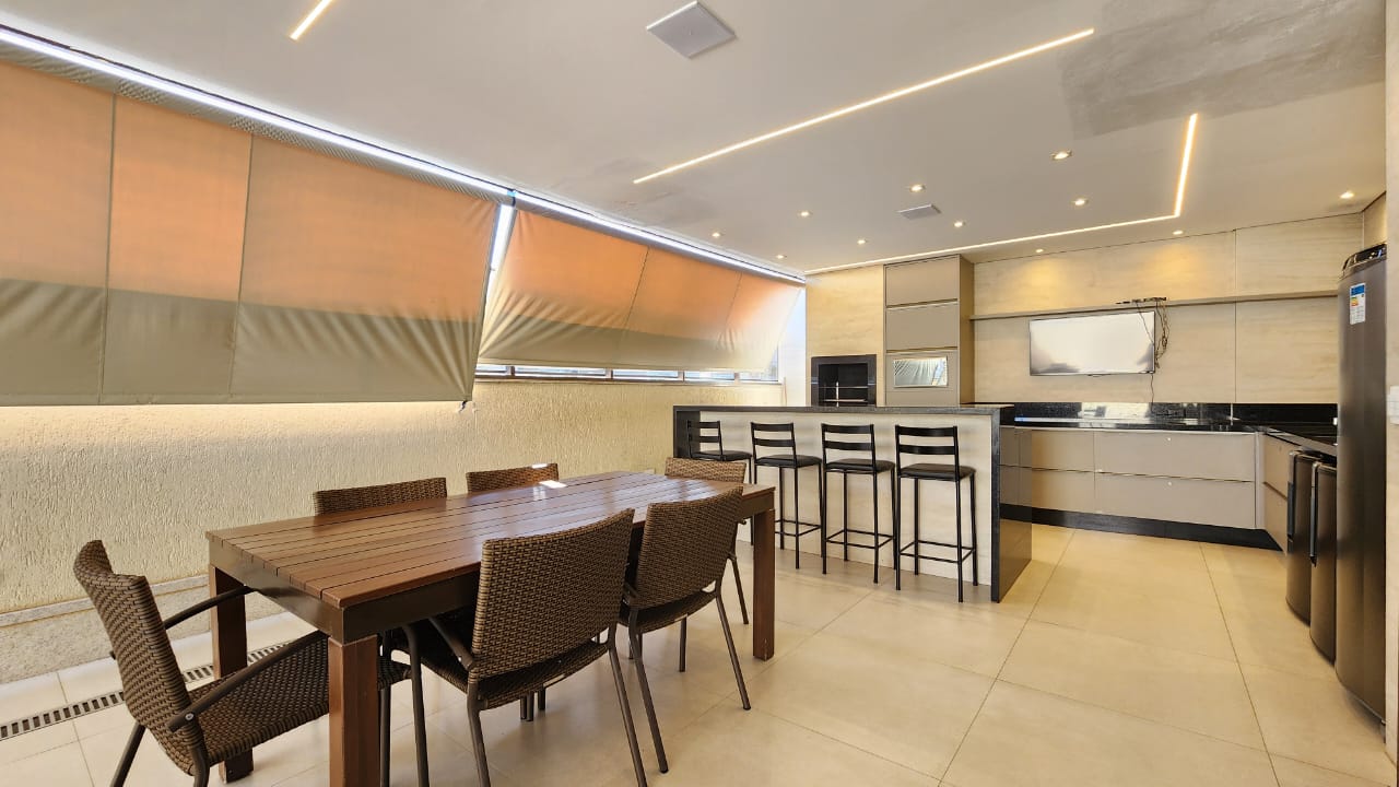 * Sala de estar climatizada com ar-condicionado, parede espelhada, cortinas blackout, painel para TV com rack e armários auxiliares; integrada à varanda gourmet com armários planejados e cortina de vidro.