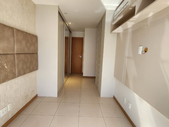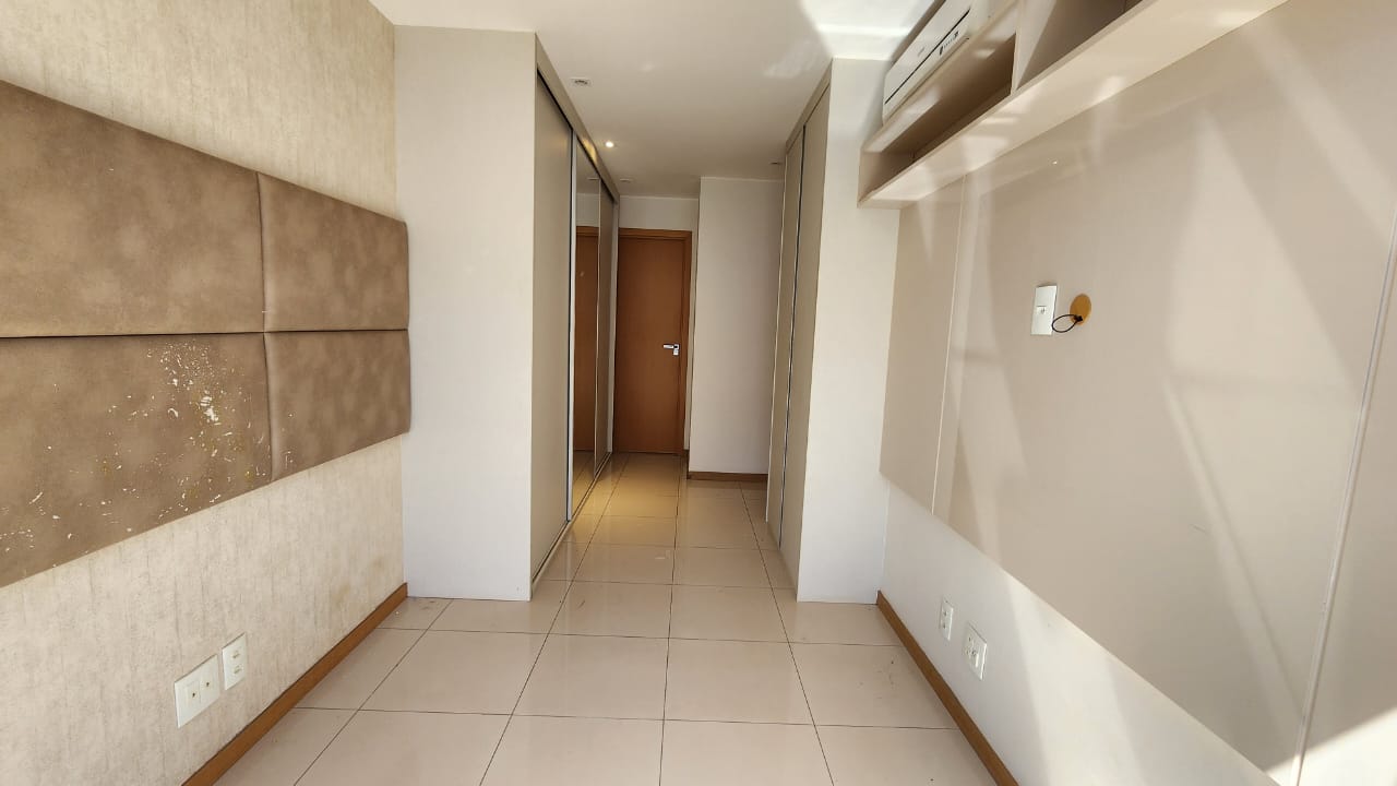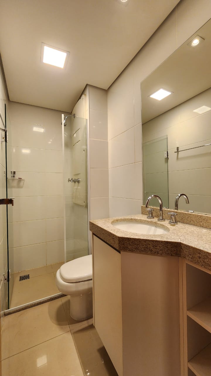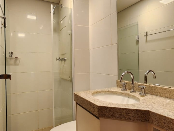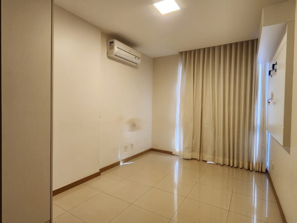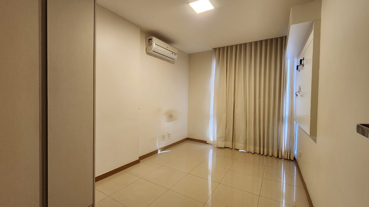 1ª Suíte com armário roupeiro, painel para TV, ar-condicionado, cortinas blackout e banheiro com armários, espelho, bancada em granito, box em vidro temperado e acessórios.