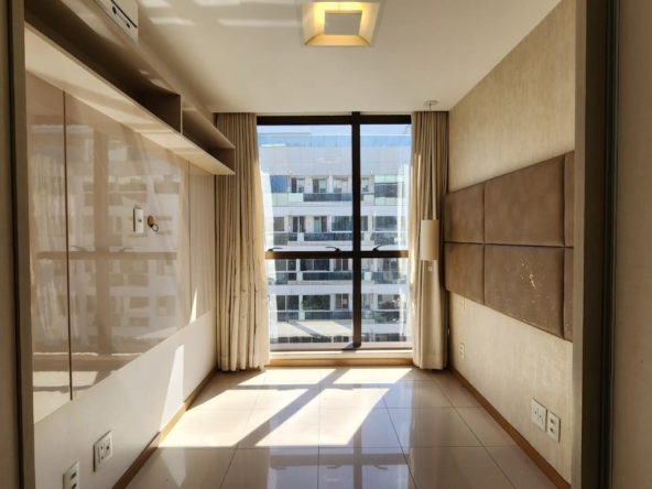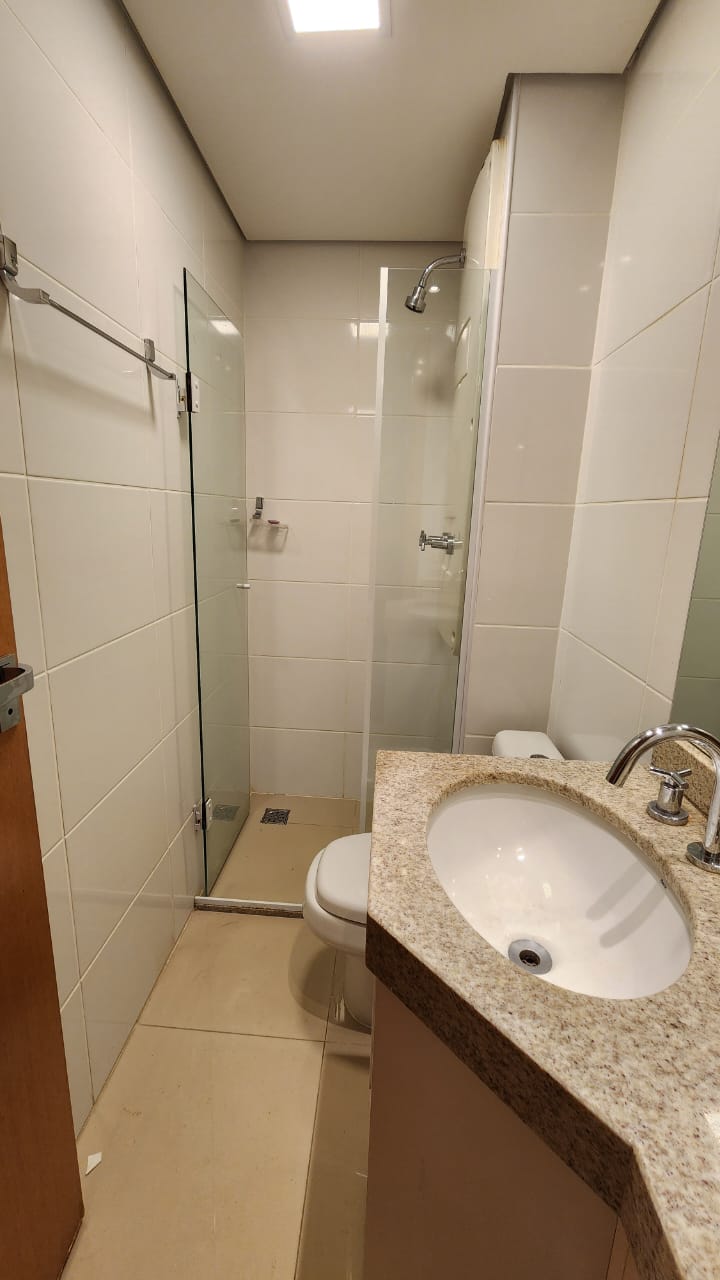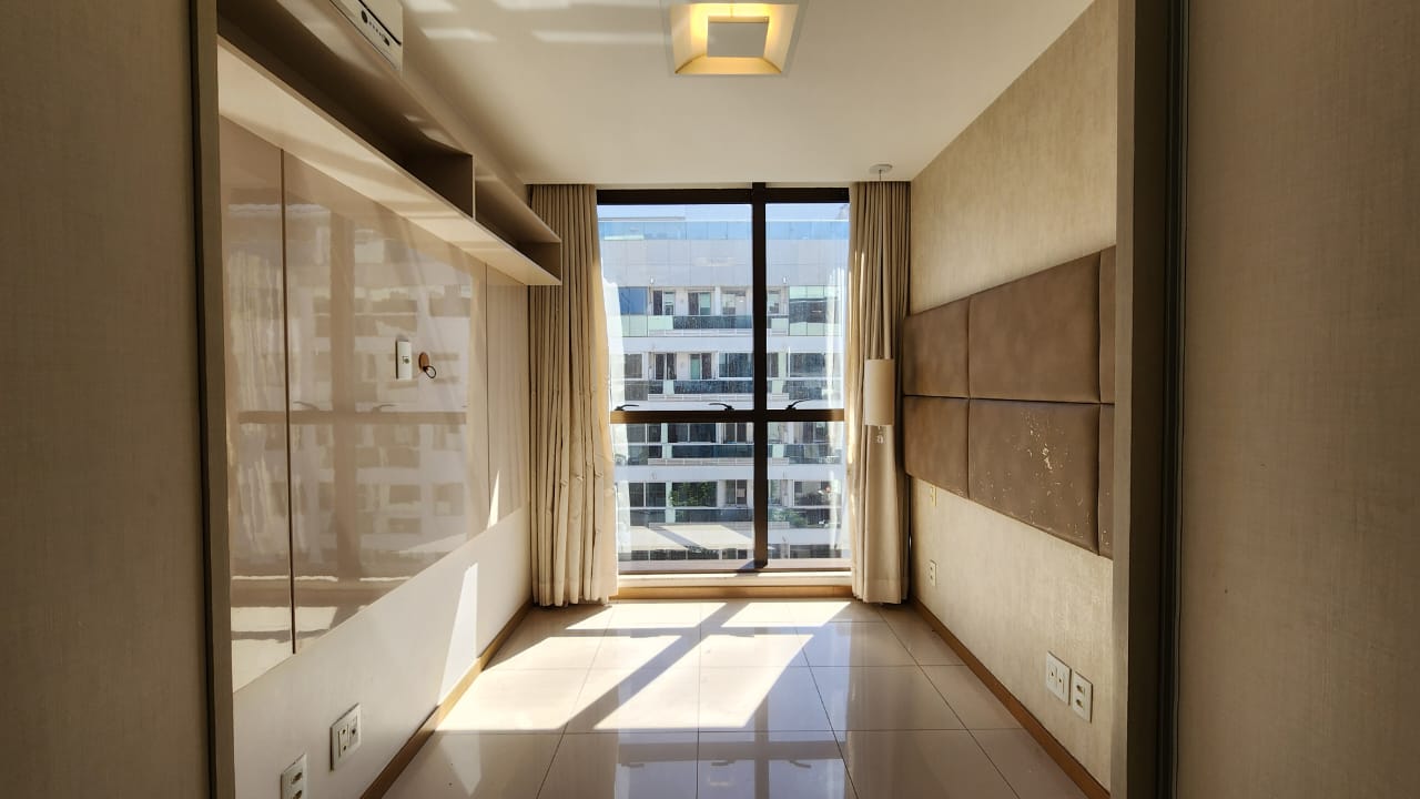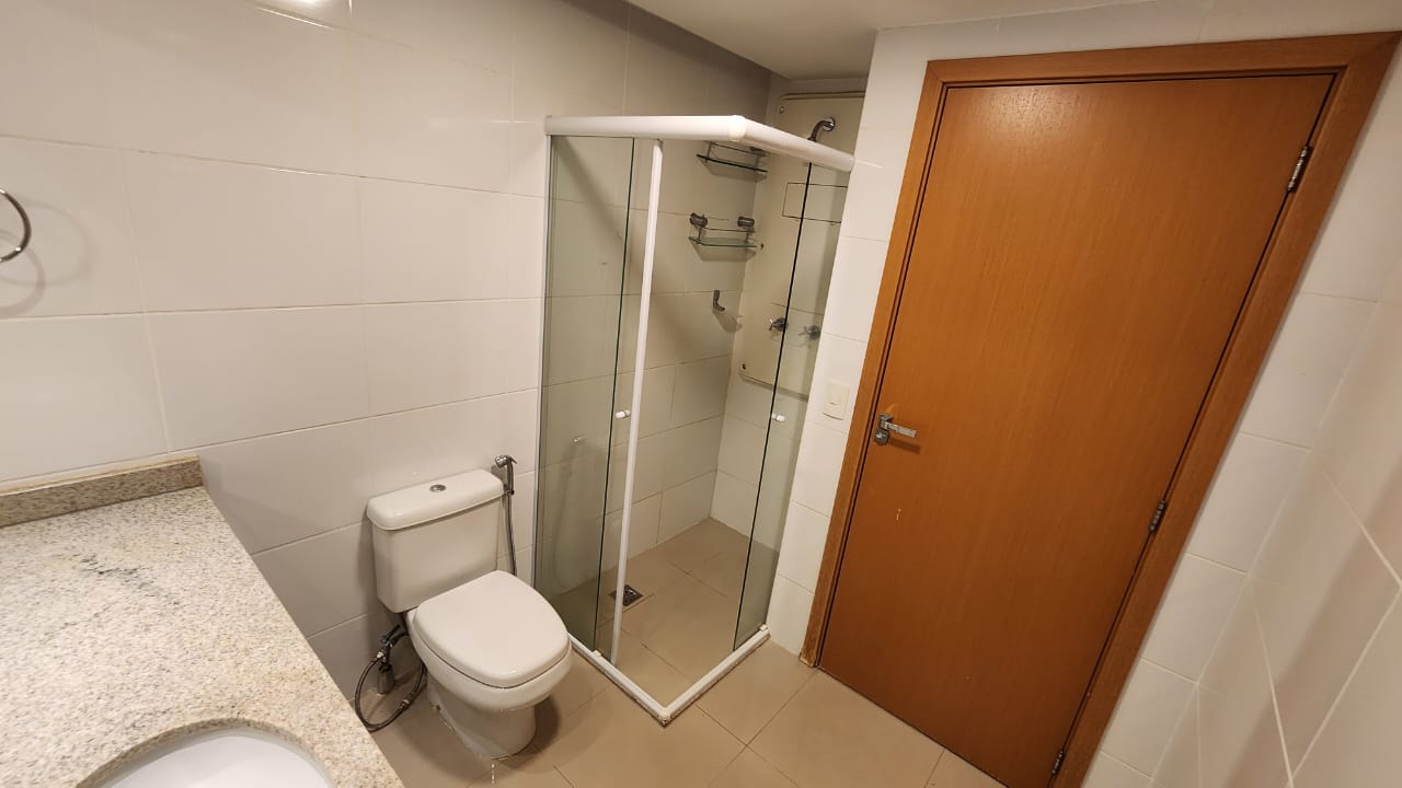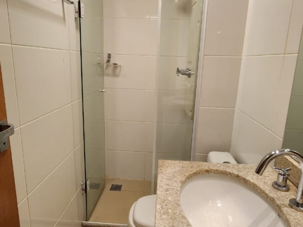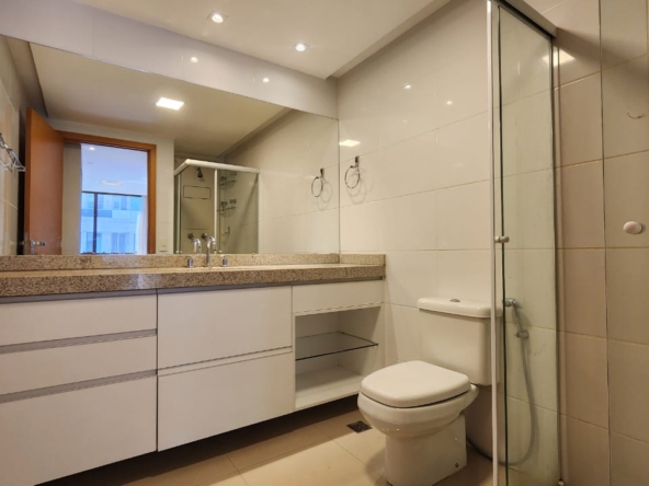 1ª Suíte com armário roupeiro, painel para TV, ar-condicionado, cortinas blackout e banheiro com armários, espelho, bancada em granito, box em vidro temperado e acessórios.