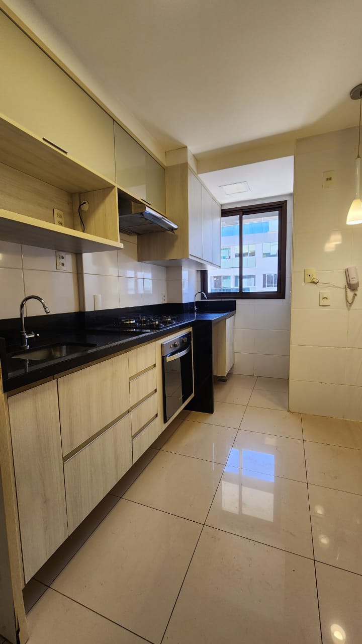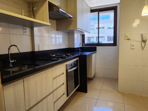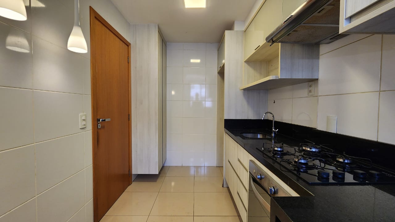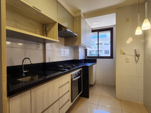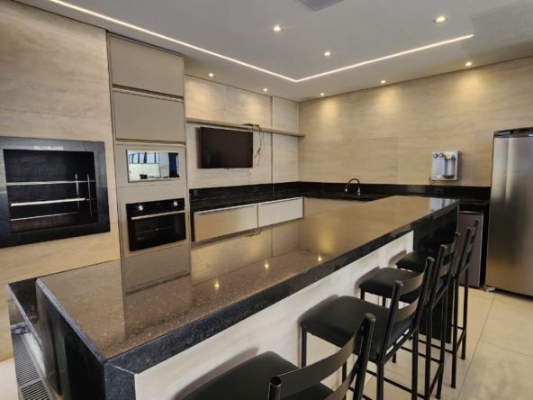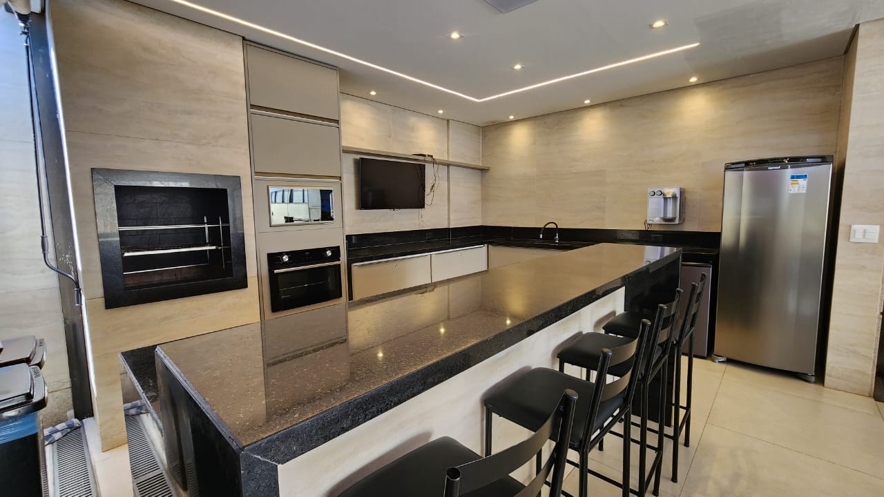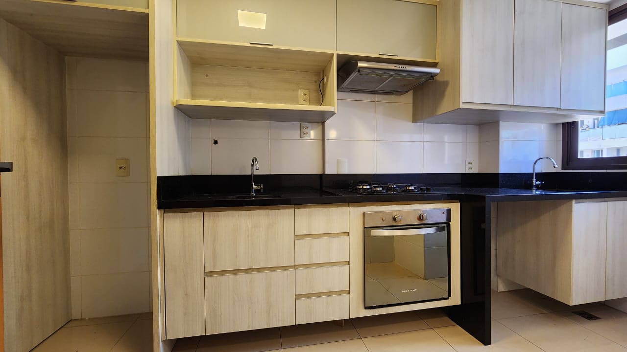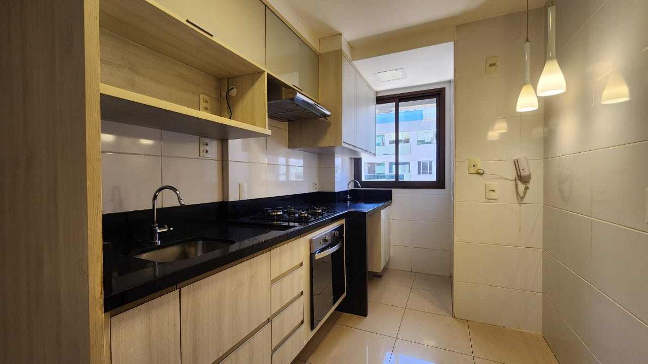 * Cozinha equipada com armários planejados, bancada em granito, fogão cooktop 4 bocas, forno embutido, exaustor, nicho para micro-ondas e luminária pendente.