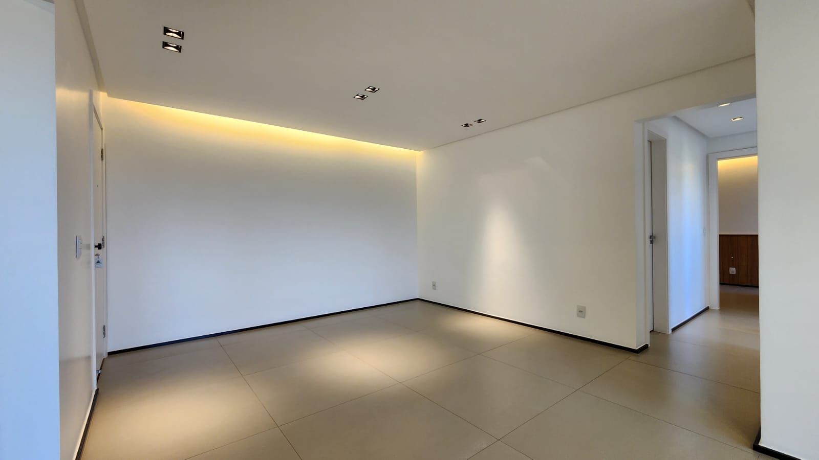 Sala ampla para dois ambientes, com teto rebaixado em gesso e iluminação planejada em LED, proporcionando um ambiente moderno e aconchegante
