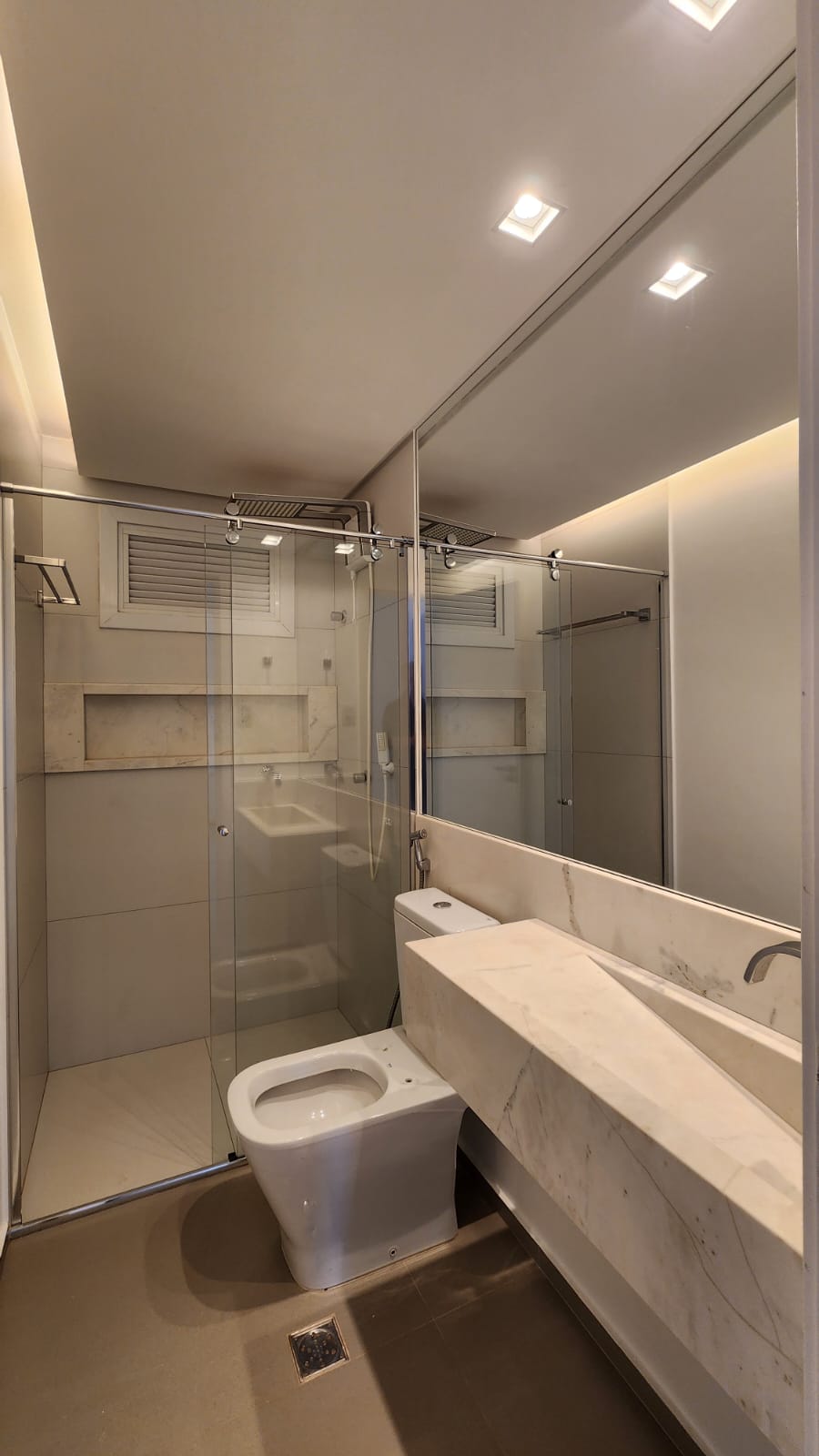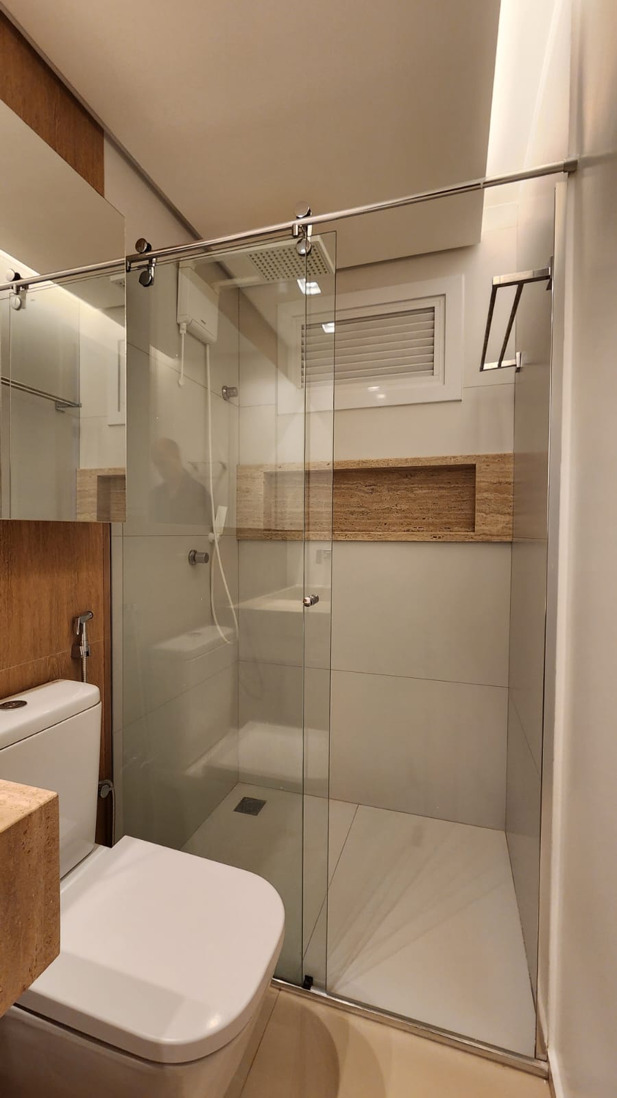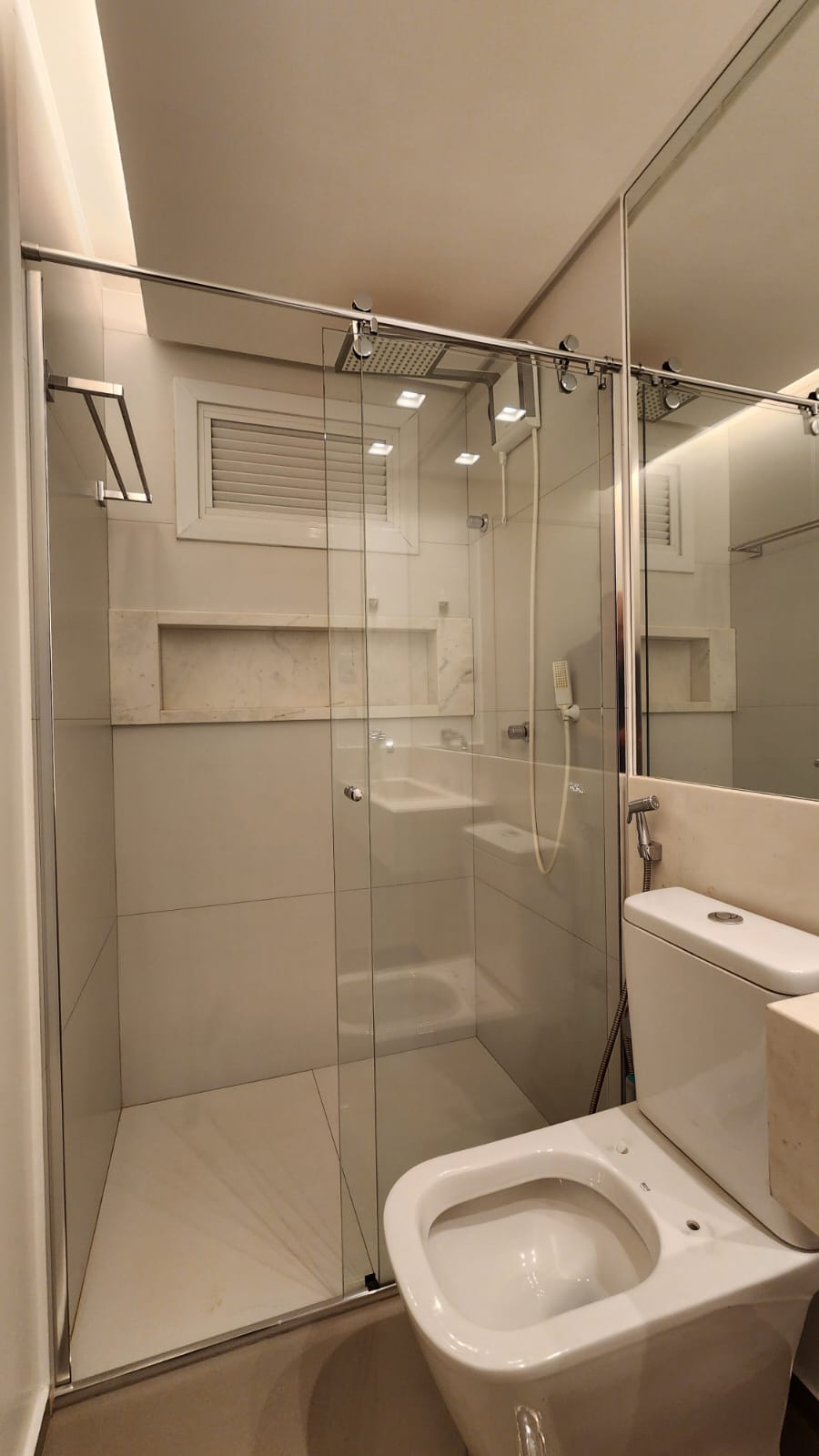 Banheiros (social e suíte) com armários planejados, espelhos e box em vidro temperado