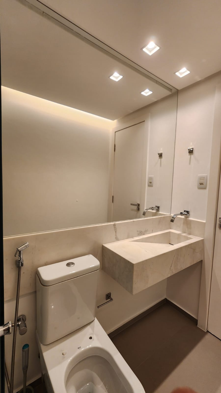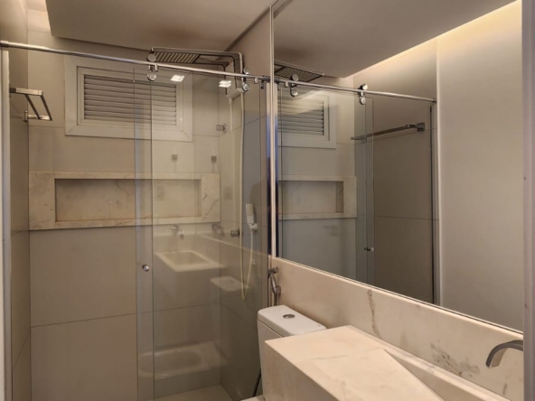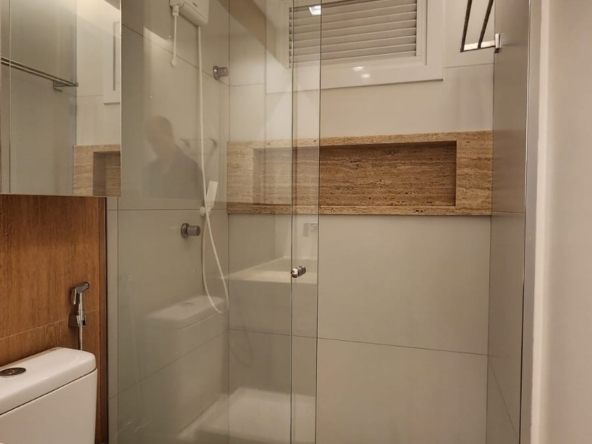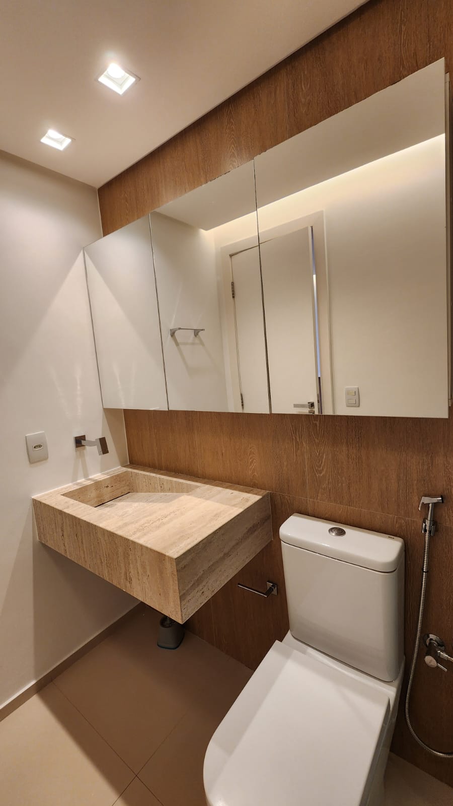 Banheiros (social e suíte) com armários planejados, espelhos e box em vidro temperado